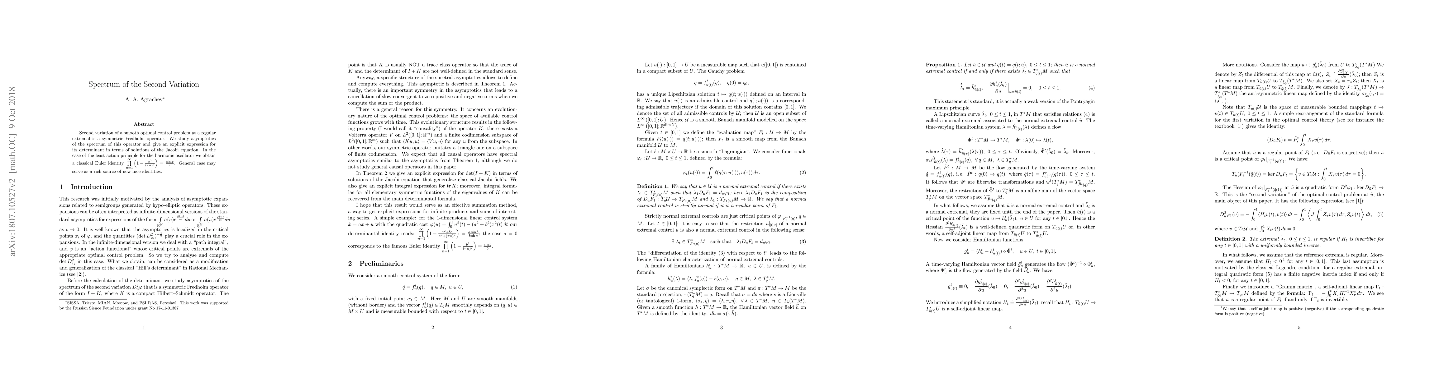 Second variation of a smooth optimal control problem at a regular extremal is a symmetric Fredholm operator. We study asymptotics of the spectrum of this operator and give an explicit expression for its determinant in terms of solutions of the Jacobi equation. In the case of the least action principle for the harmonic oscillator we obtain a classical Euler identity $\prod\limits_{n=1}^\infty\left(1-\frac{x^2}{(\pi n)^2}\right)=\frac{\sin x}{x}$. General case may serve as a rich source of new nice identities.