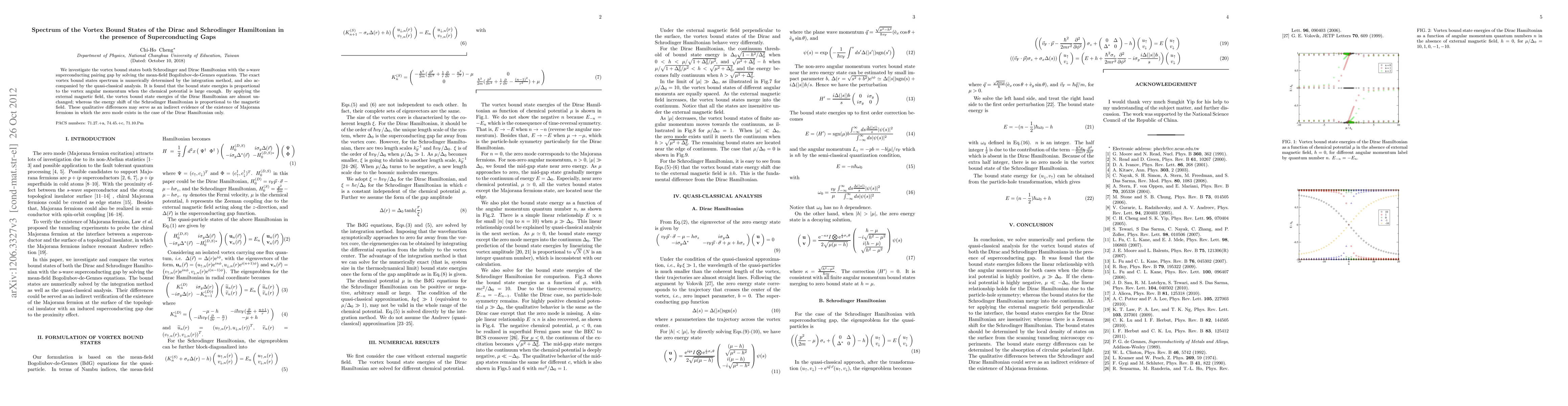 This paper investigates the vortex bound states in both Schrödinger and Dirac Hamiltonians with s-wave superconducting pairing, revealing that bound state energies are proportional to vortex angular momentum under certain conditions. The Dirac Hamiltonian's vortex bound states show minimal change with external magnetic fields, contrasting with the magnetic field-dependent energy shift in the Schrödinger Hamiltonian, suggesting the presence of Majorana fermions in the Dirac case.
