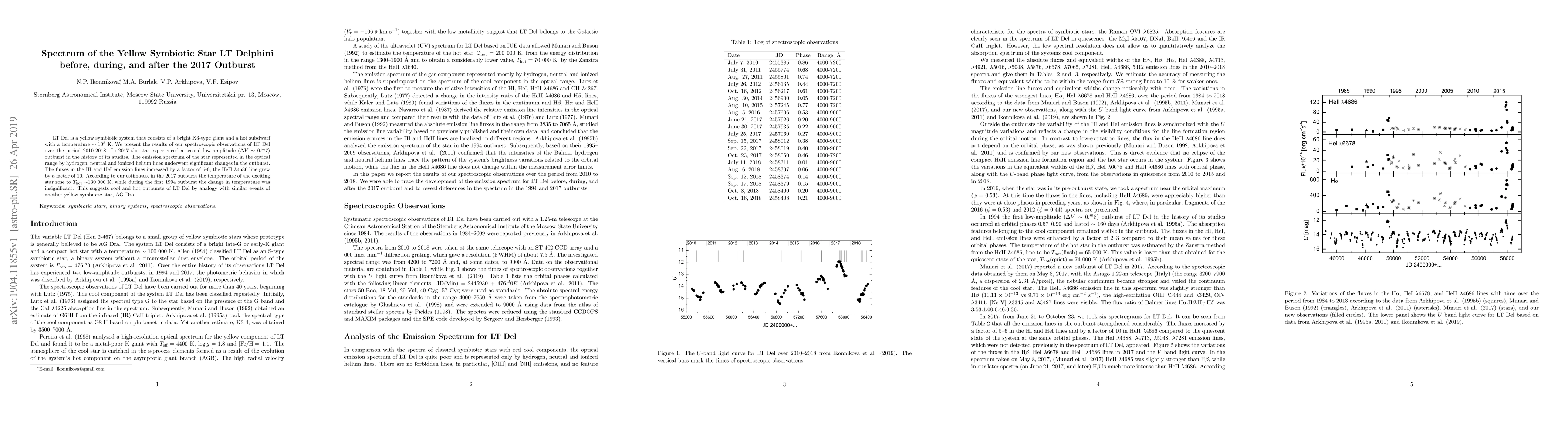 The study examines the yellow symbiotic star LT Delphini, observing it spectroscopically from 2010 to 2018, including a 2017 outburst. Notable findings include a significant increase in emission line fluxes during the outburst, a hotter exciting star (T_hot ~ 130,000 K), and a contrast with the 1994 outburst showing insignificant temperature change. This suggests LT Del's cool and hot outbursts, similar to AG Dra.