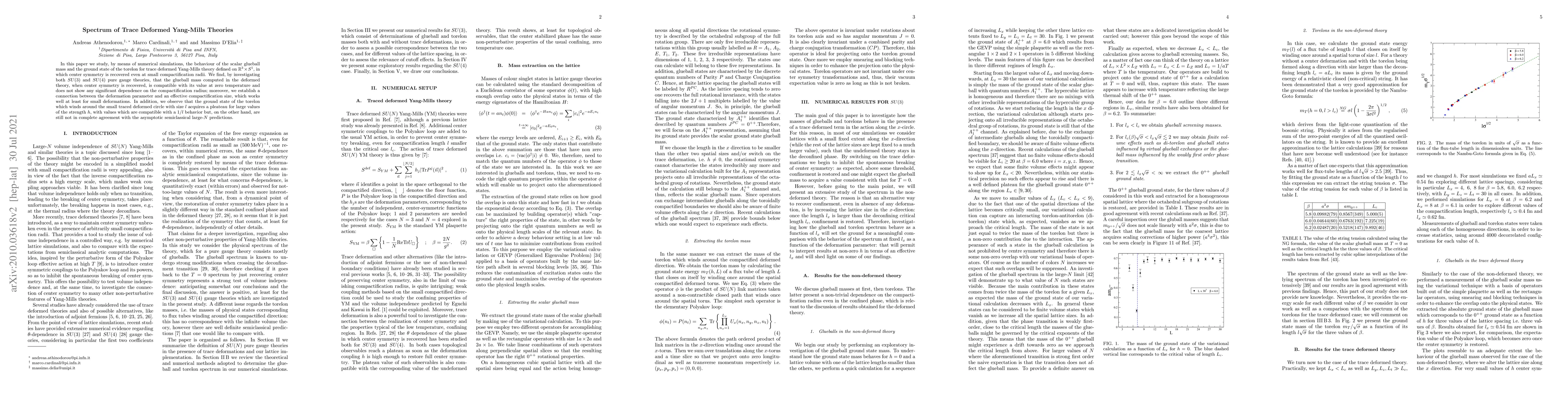 The paper presents a detailed numerical analysis of trace-deformed Yang-Mills theories, establishing a connection between the deformation parameter and an effective compactification size, and observing the behavior of scalar glueballs and torelons in these theories.