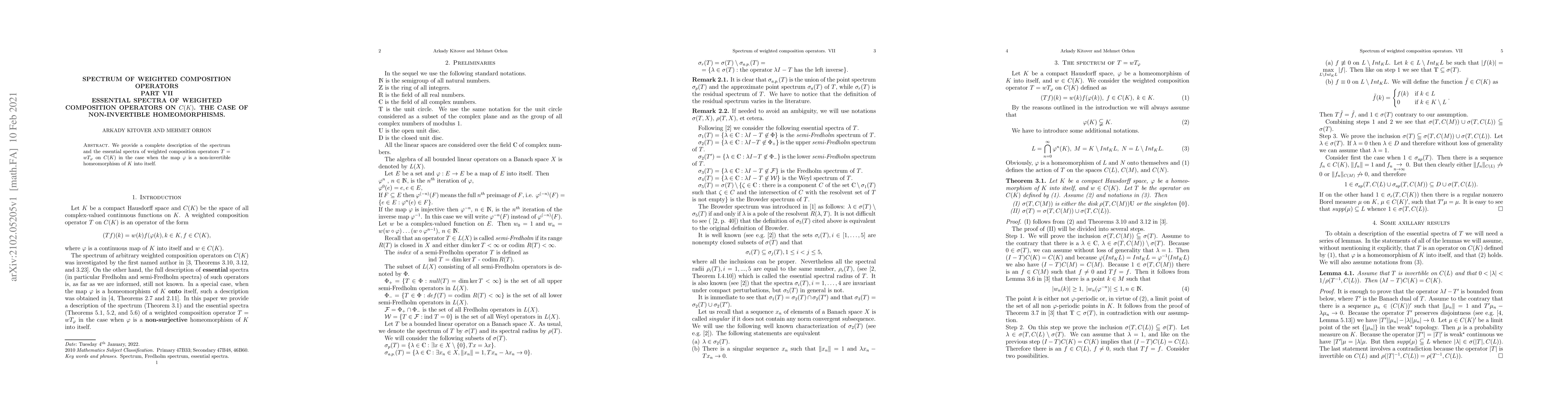 This paper describes the spectrum and essential spectra of weighted composition operators on $C(K)$ for non-invertible homeomorphisms of $K$ into itself, providing a complete classification.