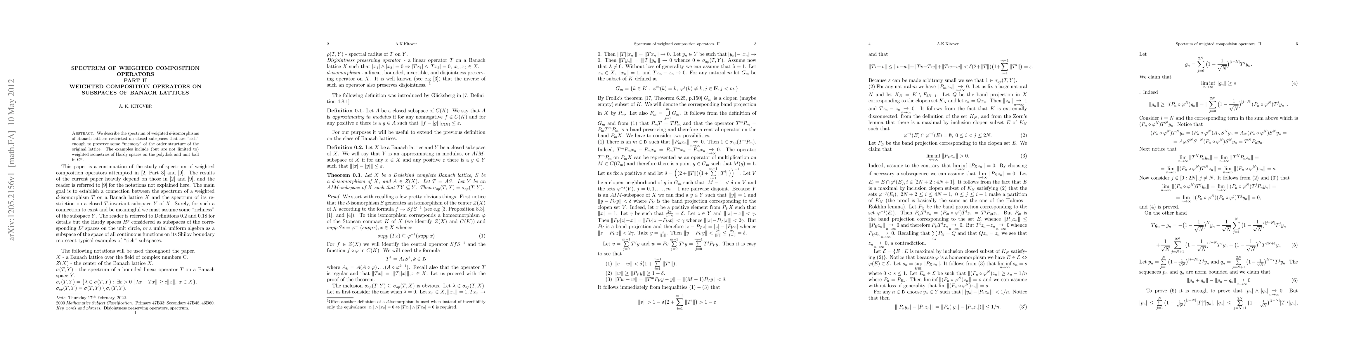 We describe the spectrum of weighted $d$-isomorphisms of Banach lattices restricted on closed subspaces that are "rich" enough to preserve some "memory" of the order structure of the original lattice. The examples include (but are not limited to) weighted isometries of Hardy spaces on the polydisk and unit ball in $\mathds{C}^n$.