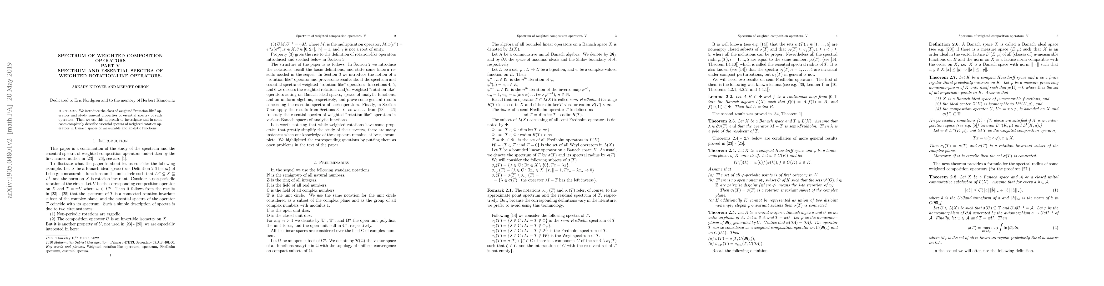 This paper introduces weighted "rotation-like" operators and examines their essential spectra, providing a comprehensive analysis of these operators in Banach spaces of measurable and analytic functions. The study aims to fully describe the essential spectra of weighted rotation operators.