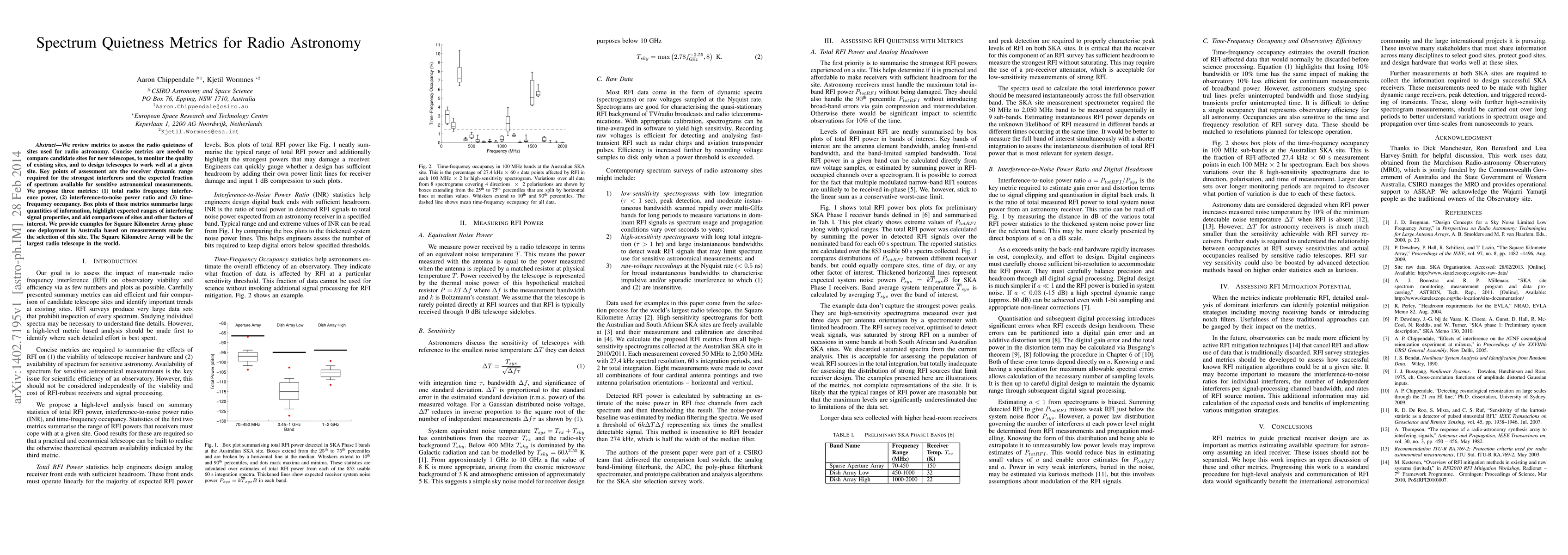 We review metrics to assess the radio quietness of sites used for radio astronomy. Concise metrics are needed to compare candidate sites for new telescopes, to monitor the quality of existing sites, and to design telescopes to work well at a given site. Key points of assessment are the receiver dynamic range required for the strongest interferers and the expected fraction of spectrum available for sensitive astronomical measurements. We propose three metrics: (1) total radio frequency interference power, (2) interference-to-noise power ratio and (3) time-frequency occupancy. Box plots of these metrics summarise large quantities of information, highlight expected ranges of interfering signal properties, and aid comparisons of sites and other factors of interest. We provide examples for Square Kilometre Array phase one deployment in Australia based on measurements made for the selection of this site. The Square Kilometre Array will be the largest radio telescope in the world.