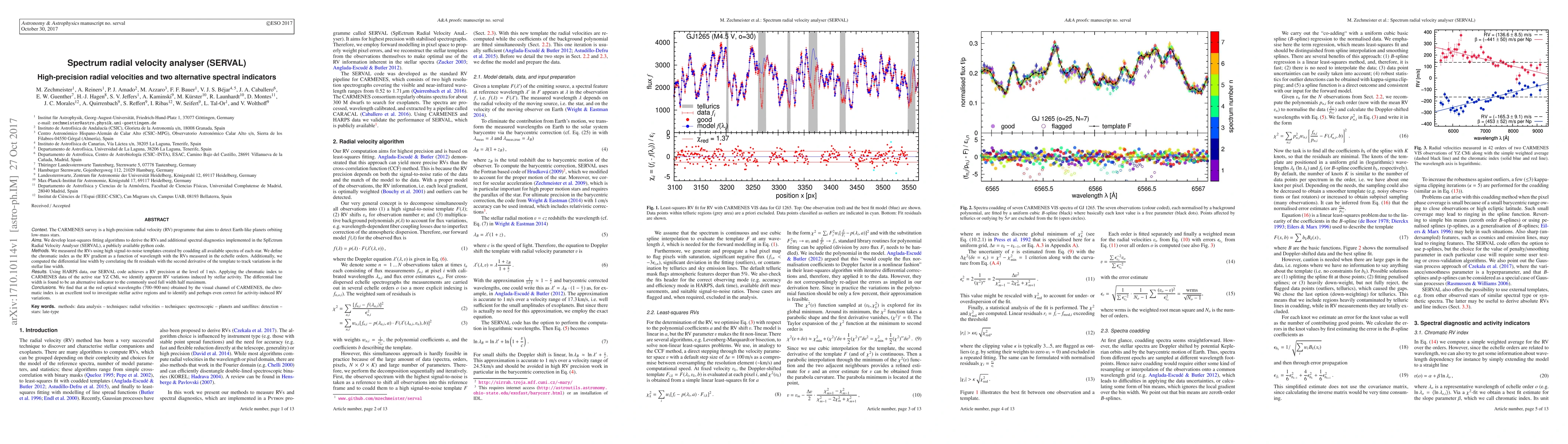 The SERVAL code, developed for the CARMENES survey, achieves high-precision radial velocities (1m/s) using least-squares fitting algorithms. It introduces the chromatic index and differential line width as alternative spectral indicators to detect stellar activity and variations.