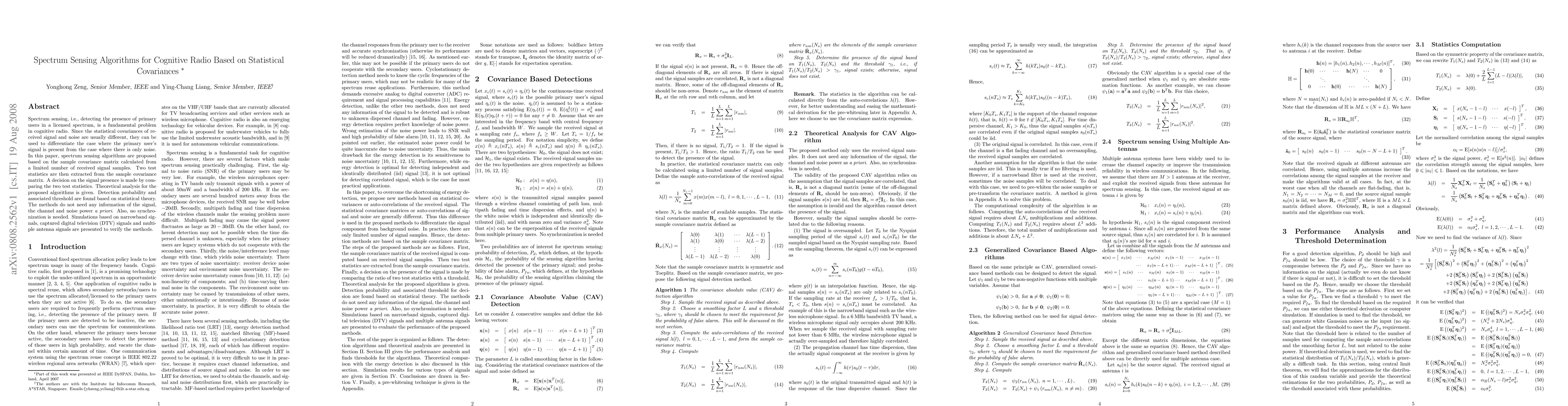 This paper proposes spectrum sensing algorithms for cognitive radio that utilize statistical covariances to detect primary users without requiring prior knowledge of signals or channel conditions. The algorithms are based on sample covariance matrices and two test statistics, validated through simulations with various signal types.