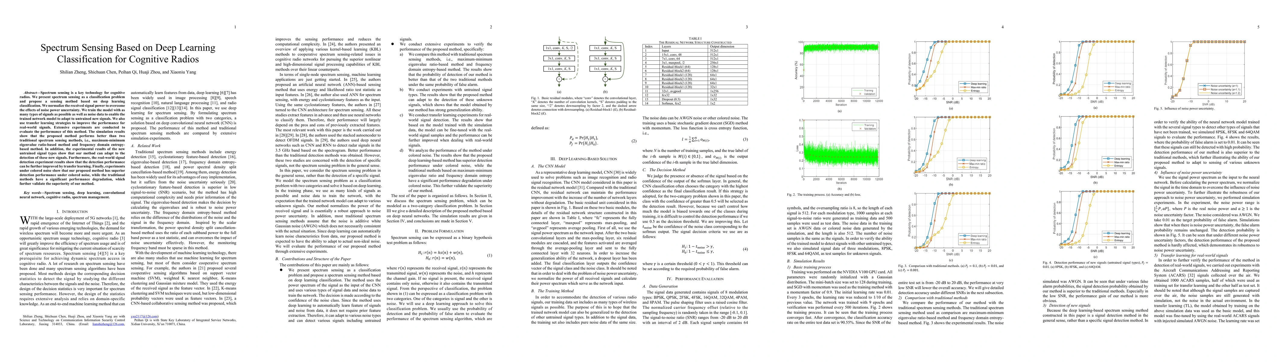 This paper proposes a deep learning classification method for spectrum sensing in cognitive radios, outperforming traditional methods like maximum-minimum eigenvalue ratio and frequency domain entropy. The method adapts to new signals through extensive training and transfer learning, demonstrating superior performance under colored noise.