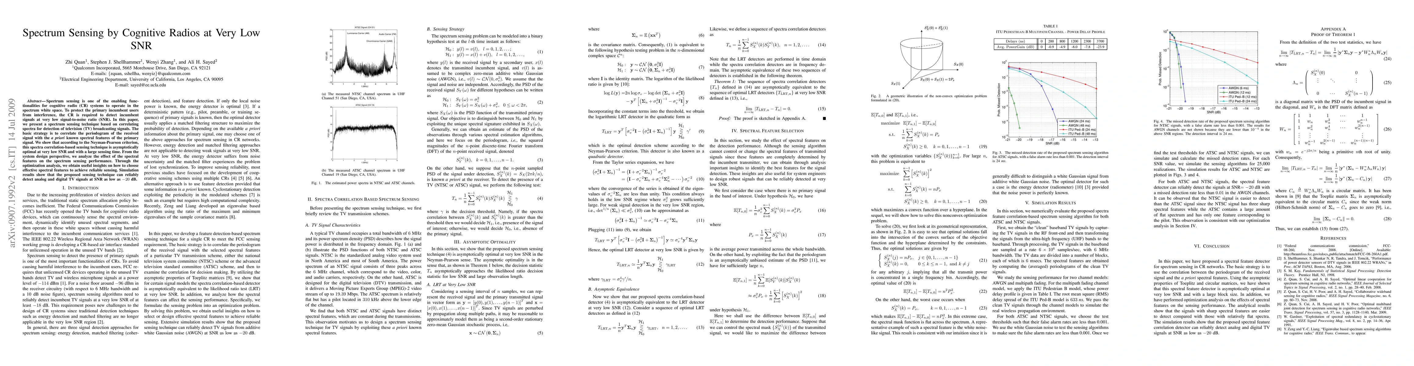This paper introduces a spectrum sensing method for cognitive radios using spectral correlation, which is optimal at very low SNRs (-20 dB and below) for detecting TV signals. The technique correlates received signal periodograms with known primary signal spectral features, offering design insights for reliable sensing.