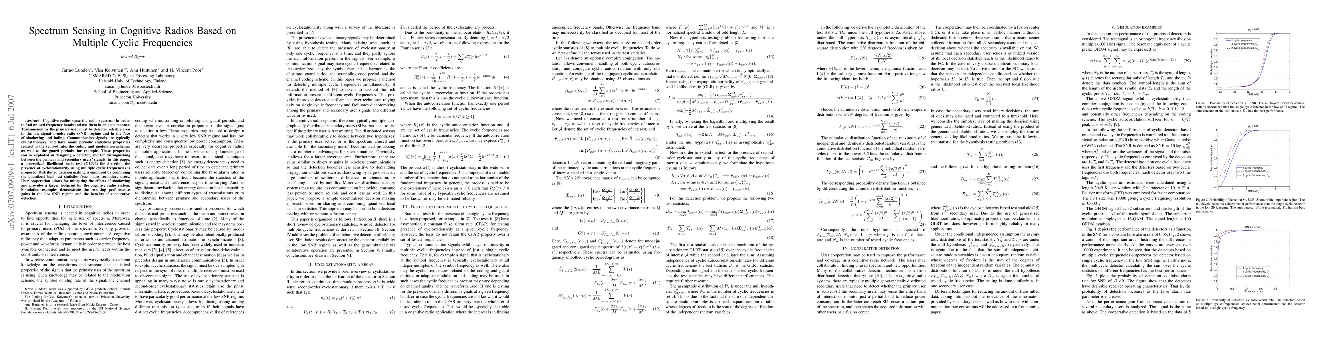 This paper proposes a generalized likelihood ratio test (GLRT) for detecting cyclostationarity in cognitive radios using multiple cyclic frequencies, enhancing spectrum sensing in low SNR conditions. Cooperative detection among secondary users improves reliability and mitigates shadowing effects, demonstrating performance gains through simulations.