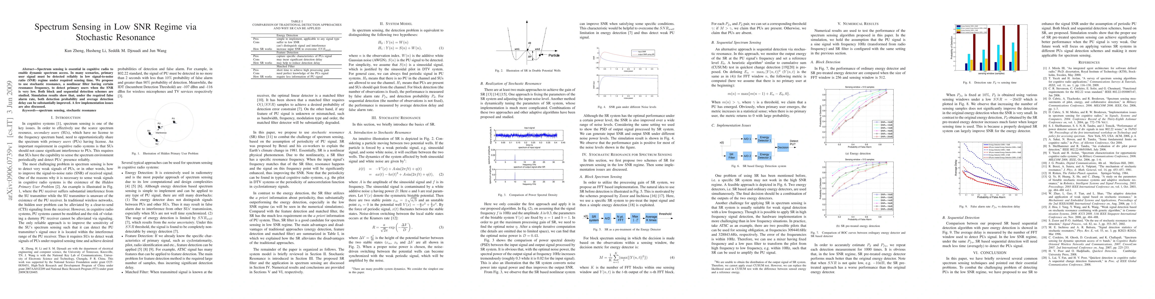 This paper proposes using stochastic resonance to enhance spectrum sensing in cognitive radio under low signal-to-noise ratio conditions. Simulation results demonstrate significant improvements in detection probability and reduced average detection delay compared to traditional methods.