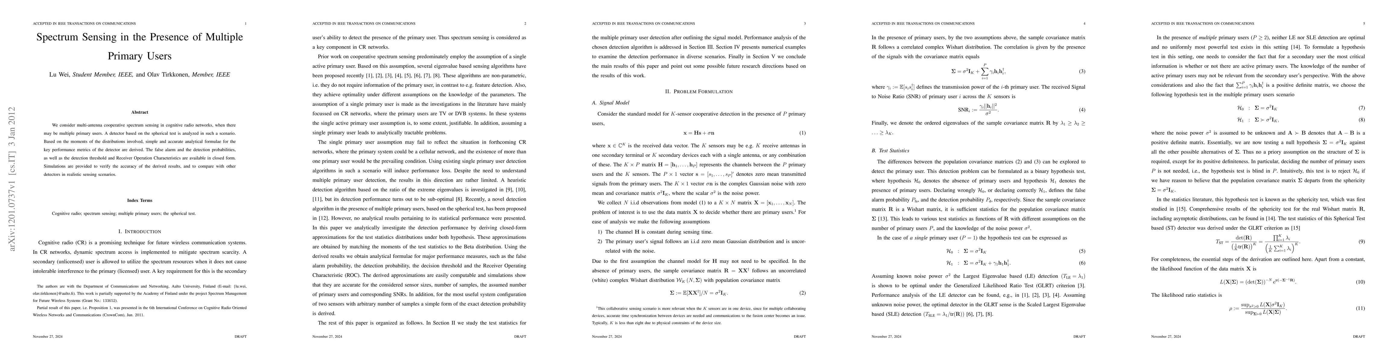We consider multi-antenna cooperative spectrum sensing in cognitive radio networks, when there may be multiple primary users. A detector based on the spherical test is analyzed in such a scenario. Based on the moments of the distributions involved, simple and accurate analytical formulae for the key performance metrics of the detector are derived. The false alarm and the detection probabilities, as well as the detection threshold and Receiver Operation Characteristics are available in closed form. Simulations are provided to verify the accuracy of the derived results, and to compare with other detectors in realistic sensing scenarios.