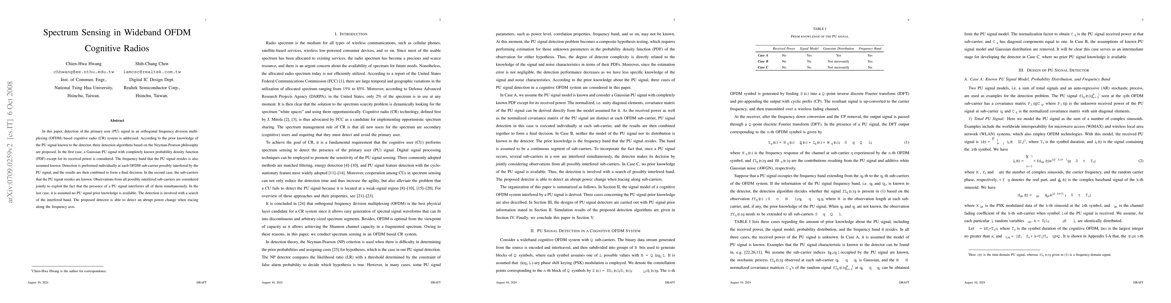 In this paper, detection of the primary user (PU) signal in an orthogonal frequency division multiplexing (OFDM) based cognitive radio (CR) system is addressed. According to the prior knowledge of the PU signal known to the detector, three detection algorithms based on the Neyman-Pearson philosophy are proposed. In the first case, a Gaussian PU signal with completely known probability density function (PDF) except for its received power is considered. The frequency band that the PU signal resides is also assumed known. Detection is performed individually at each OFDM sub-carrier possibly interfered by the PU signal, and the results are then combined to form a final decision. In the second case, the sub-carriers that the PU signal resides are known. Observations from all possibly interfered sub-carriers are considered jointly to exploit the fact that the presence of a PU signal interferers all of them simultaneously. In the last case, it is assumed no PU signal prior knowledge is available. The detection is involved with a search of the interfered band. The proposed detector is able to detect an abrupt power change when tracing along the frequency axis.