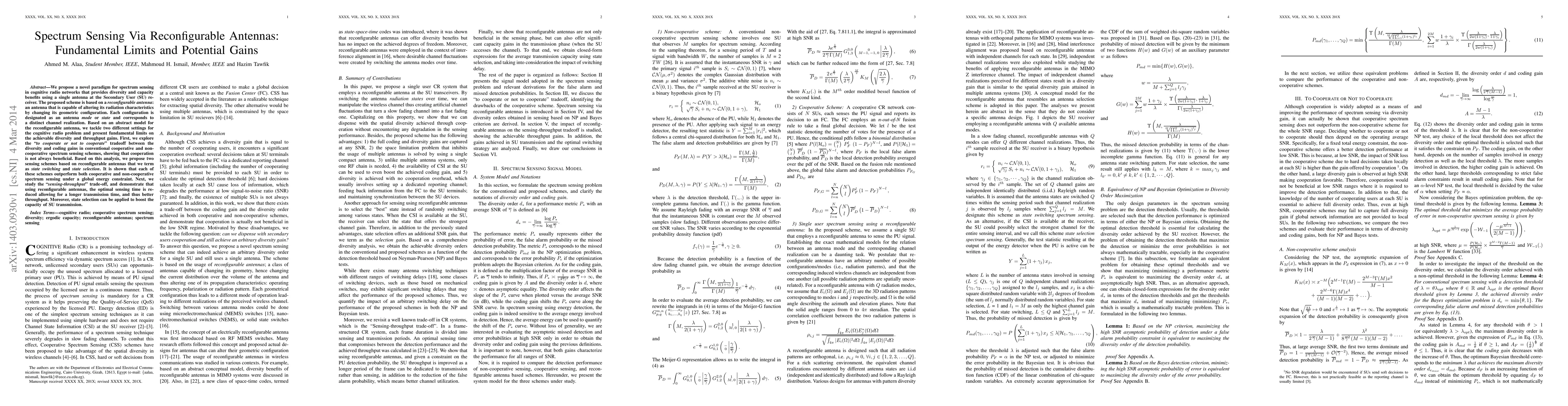 This paper proposes a novel spectrum sensing paradigm for cognitive radio networks using reconfigurable antennas, demonstrating that it can outperform both cooperative and non-cooperative sensing schemes by optimizing energy usage and achieving better throughput. The study also reveals that optimal sensing time can be reduced to enhance transmission time and capacity.
