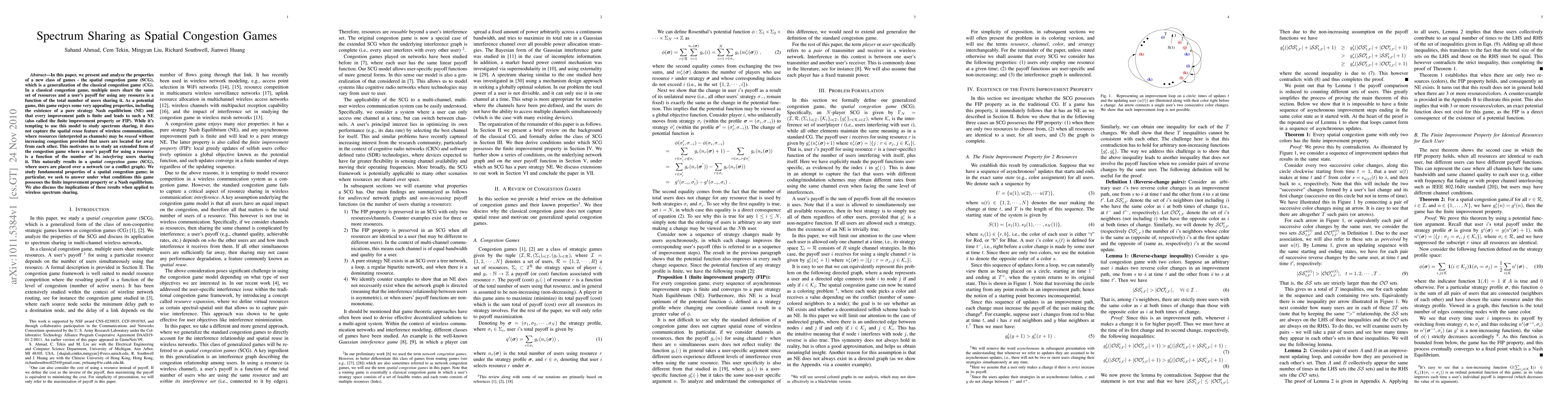 Researchers developed a new game model, spatial congestion games, to study spectrum sharing in wireless communication, focusing on conditions for Nash equilibria and finite improvement properties.