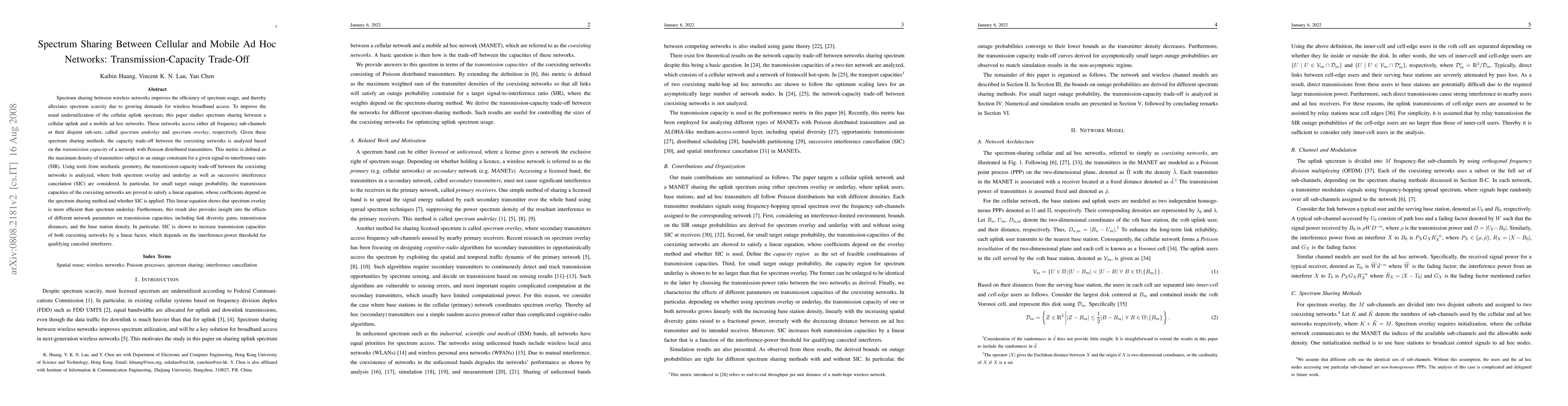 Spectrum sharing between wireless networks improves the efficiency of spectrum usage, and thereby alleviates spectrum scarcity due to growing demands for wireless broadband access. To improve the usual underutilization of the cellular uplink spectrum, this paper studies spectrum sharing between a cellular uplink and a mobile ad hoc networks. These networks access either all frequency sub-channels or their disjoint sub-sets, called spectrum underlay and spectrum overlay, respectively. Given these spectrum sharing methods, the capacity trade-off between the coexisting networks is analyzed based on the transmission capacity of a network with Poisson distributed transmitters. This metric is defined as the maximum density of transmitters subject to an outage constraint for a given signal-to-interference ratio (SIR). Using tools from stochastic geometry, the transmission-capacity trade-off between the coexisting networks is analyzed, where both spectrum overlay and underlay as well as successive interference cancelation (SIC) are considered. In particular, for small target outage probability, the transmission capacities of the coexisting networks are proved to satisfy a linear equation, whose coefficients depend on the spectrum sharing method and whether SIC is applied. This linear equation shows that spectrum overlay is more efficient than spectrum underlay. Furthermore, this result also provides insight into the effects of different network parameters on transmission capacities, including link diversity gains, transmission distances, and the base station density. In particular, SIC is shown to increase transmission capacities of both coexisting networks by a linear factor, which depends on the interference-power threshold for qualifying canceled interferers.