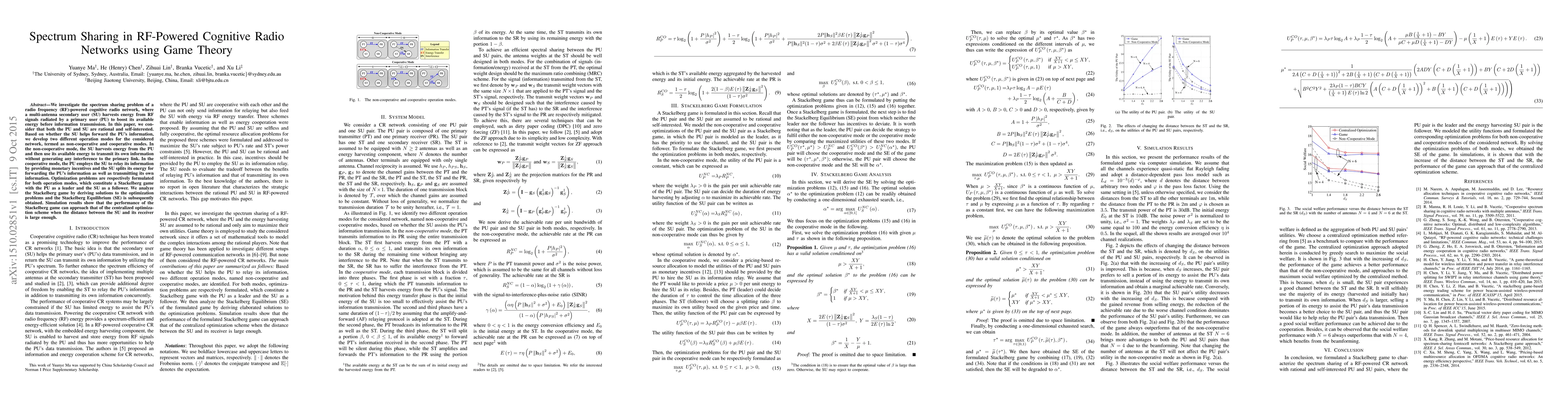 This paper explores spectrum sharing in RF-powered cognitive radio networks through game theory, distinguishing between non-cooperative and cooperative modes. It formulates optimization problems as a Stackelberg game, achieving optimal solutions and demonstrating that the game's performance can rival centralized optimization under certain conditions.