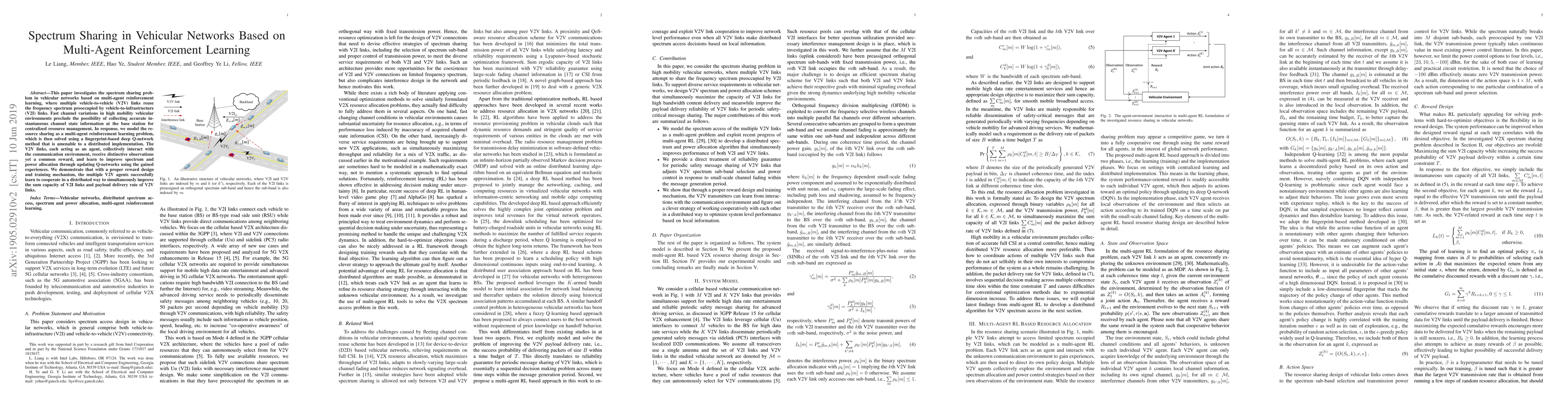 This paper explores spectrum sharing in vehicular networks via multi-agent reinforcement learning, where V2V links share spectrum with V2I links. It uses a distributed fingerprint-based deep Q-network to enable V2V agents to learn optimal spectrum and power allocation, successfully improving both V2I sum capacity and V2V payload delivery.