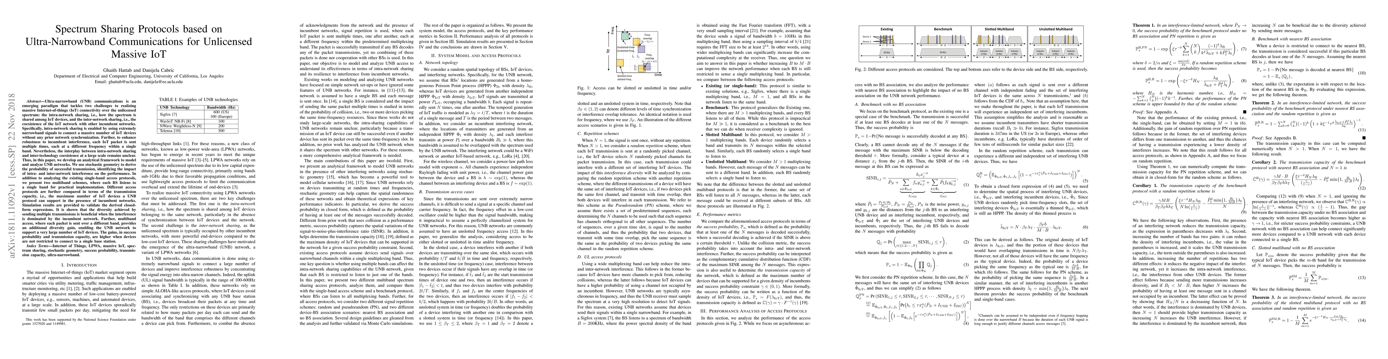 An analytical framework based on stochastic geometry is developed to model and analyze ultra-narrowband (UNB) communications for massive IoT in the unlicensed spectrum, addressing intra-network and inter-network sharing challenges.