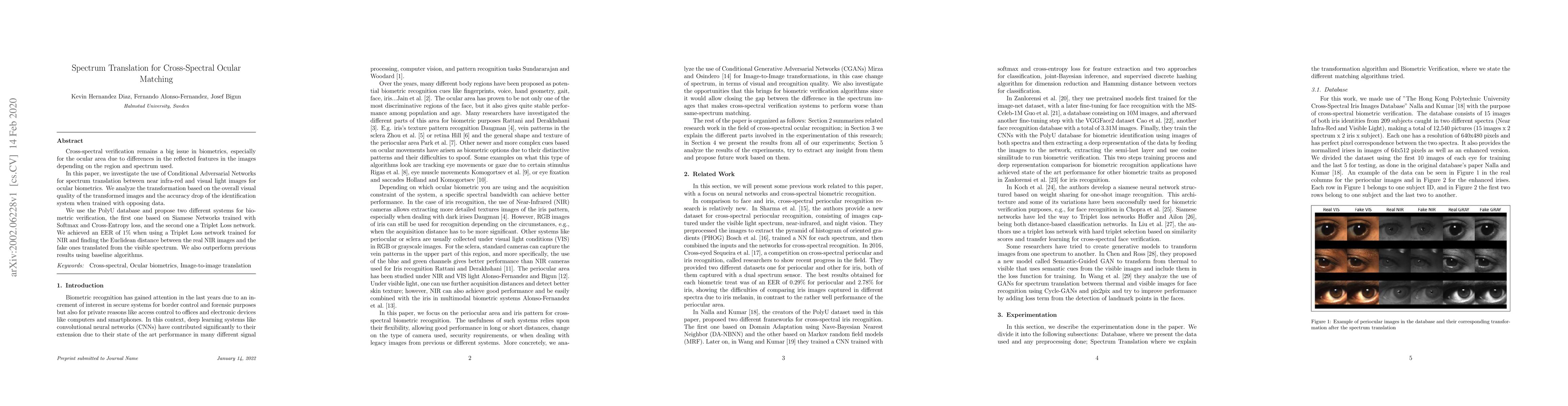 This paper explores the use of Conditional Adversarial Networks for translating near infra-red to visible light images to improve cross-spectral ocular biometric verification. The study achieves an Equal Error Rate (EER) of 1% using a Triplet Loss network, outperforming previous baselines.