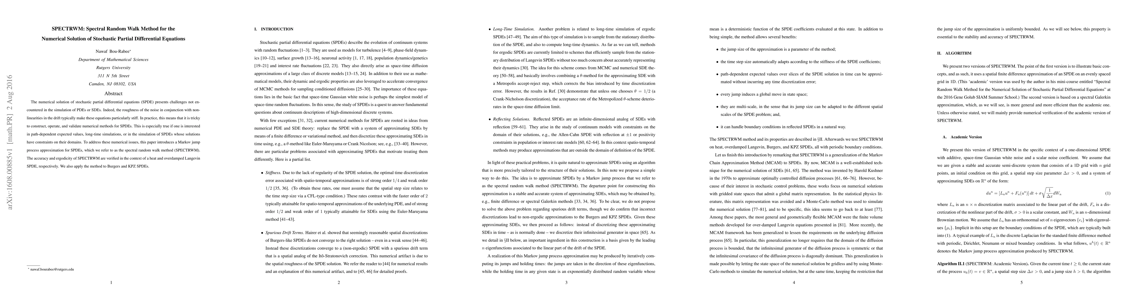 This paper introduces SPECTRWM, a spectral random walk method for solving stochastic partial differential equations (SPDEs), which addresses the challenges posed by noise roughness and nonlinearities. The method's accuracy and ergodicity are validated through simulations of heat and overdamped Langevin SPDEs, and it is also applied to Burgers and KPZ SPDEs.