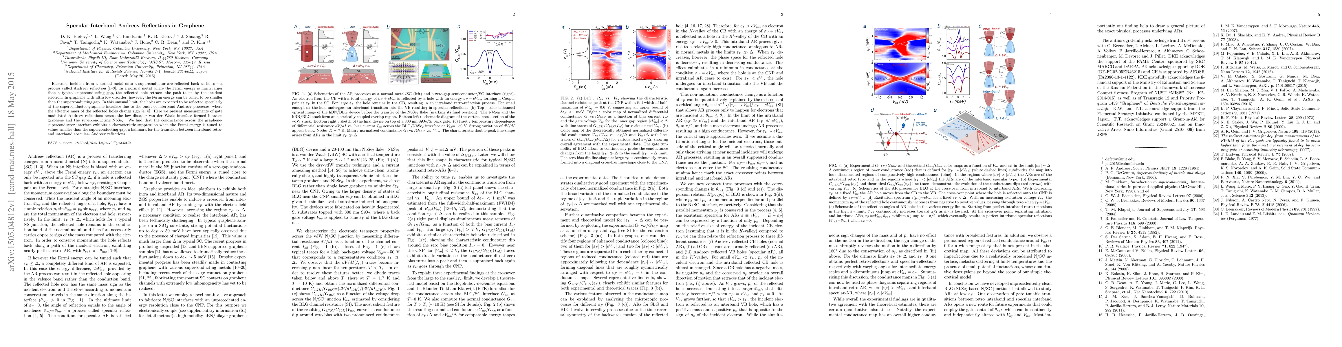 This paper investigates specular interband Andreev reflections in graphene, demonstrating that when the Fermi energy is tuned below the superconducting gap, reflected holes undergo specular reflection at the graphene-superconductor interface. Measurements show a conductance suppression indicative of the transition from intraband to interband Andreev reflections.