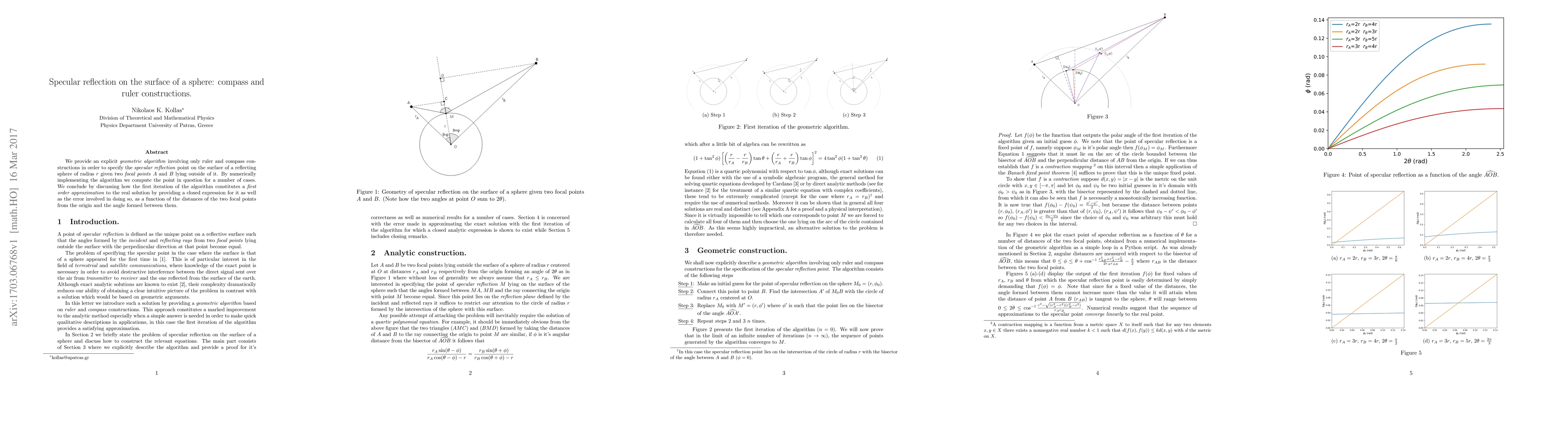 This paper presents a geometric algorithm using only ruler and compass constructions to determine the specular reflection point on a sphere's surface given two external focal points. The first iteration of the algorithm provides a first-order approximation to the exact reflection point, with an analysis of the error based on the focal points' distances and the angle between them.