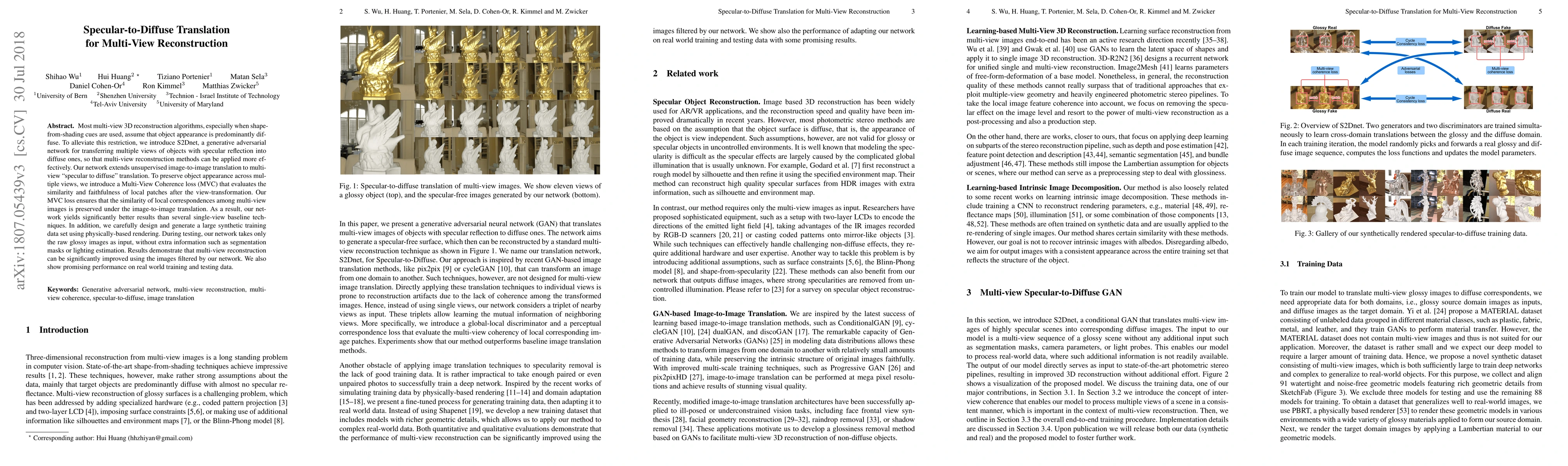 This paper introduces S2Dnet, a generative adversarial network that translates specular reflections in multi-view images to diffuse ones, enabling effective multi-view 3D reconstruction. The network employs a Multi-View Coherence loss to maintain local patch similarity across views, significantly outperforming single-view baselines and demonstrating improved reconstruction results on both synthetic and real-world data.