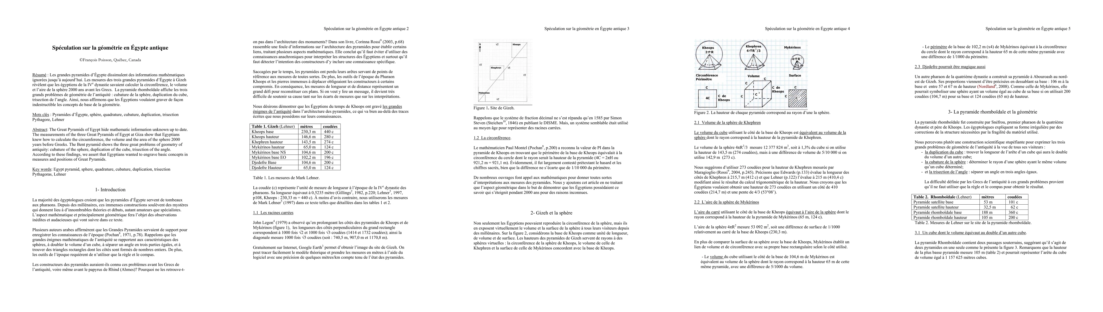 The Great Pyramids of Egypt hide mathematic information unknown up to date. The measurements of the three Great Pyramids of Egypt at Giza show that Egyptians knew how to calculate the circumference, the volume and the area of the sphere 2000 years before Greeks. The Bent pyramid shows the three great problems of geometry of antiquity: cubature of the sphere, duplication of the cube, trisection of the angle. According to these findings, we assert that Egyptians wanted to engrave basic concepts in measures and positions of Great Pyramids.--Les grandes pyramides d'\'Egypte dissimulent des informations math\'ematiques ignor\'ees jusqu'\`a aujourd'hui. Les mesures des trois grandes pyramides d'\'Egypte \`a Gizeh r\'ev\`elent que les \'egyptiens de la IVe dynastie savaient calculer la circonf\'erence, le volume et l'aire de la sph\`ere 2000 ans avant les Grecs. La pyramide rhombo\"idale affiche les trois grands probl\`emes de g\'eom\'etrie de l'antiquit\'e : cubature de la sph\`ere, duplication du cube, trisection de l'angle. Ainsi, nous affirmons que les \'Egyptiens voulaient graver de fa\c{c}on indestructible les concepts de base de la g\'eom\'etrie.