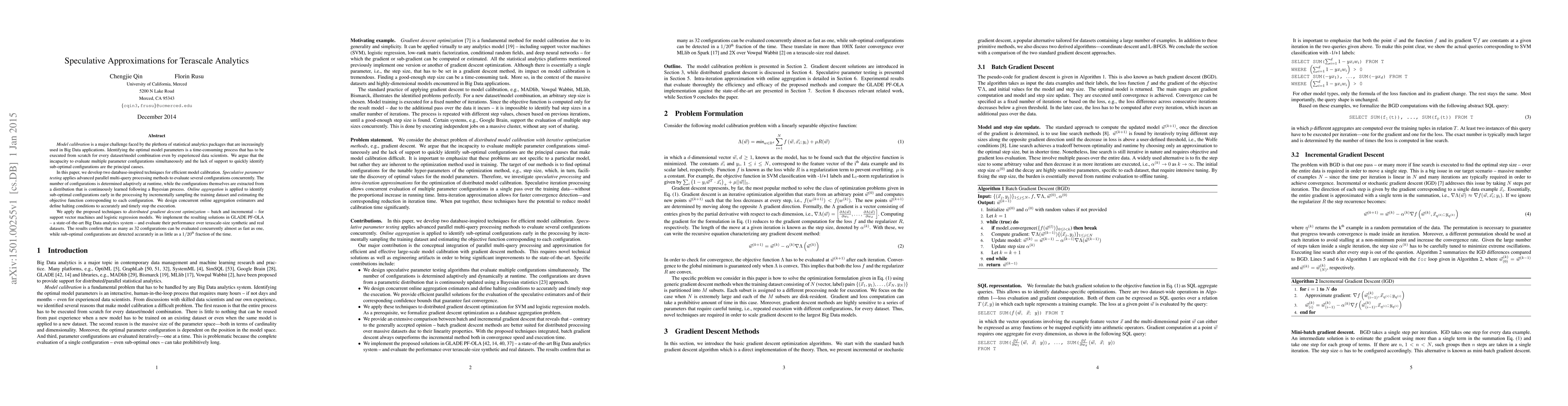 Model calibration is a major challenge faced by the plethora of statistical analytics packages that are increasingly used in Big Data applications. Identifying the optimal model parameters is a time-consuming process that has to be executed from scratch for every dataset/model combination even by experienced data scientists. We argue that the incapacity to evaluate multiple parameter configurations simultaneously and the lack of support to quickly identify sub-optimal configurations are the principal causes. In this paper, we develop two database-inspired techniques for efficient model calibration. Speculative parameter testing applies advanced parallel multi-query processing methods to evaluate several configurations concurrently. The number of configurations is determined adaptively at runtime, while the configurations themselves are extracted from a distribution that is continuously learned following a Bayesian process. Online aggregation is applied to identify sub-optimal configurations early in the processing by incrementally sampling the training dataset and estimating the objective function corresponding to each configuration. We design concurrent online aggregation estimators and define halting conditions to accurately and timely stop the execution. We apply the proposed techniques to distributed gradient descent optimization -- batch and incremental -- for support vector machines and logistic regression models. We implement the resulting solutions in GLADE PF-OLA -- a state-of-the-art Big Data analytics system -- and evaluate their performance over terascale-size synthetic and real datasets. The results confirm that as many as 32 configurations can be evaluated concurrently almost as fast as one, while sub-optimal configurations are detected accurately in as little as a $1/20^{\text{th}}$ fraction of the time.