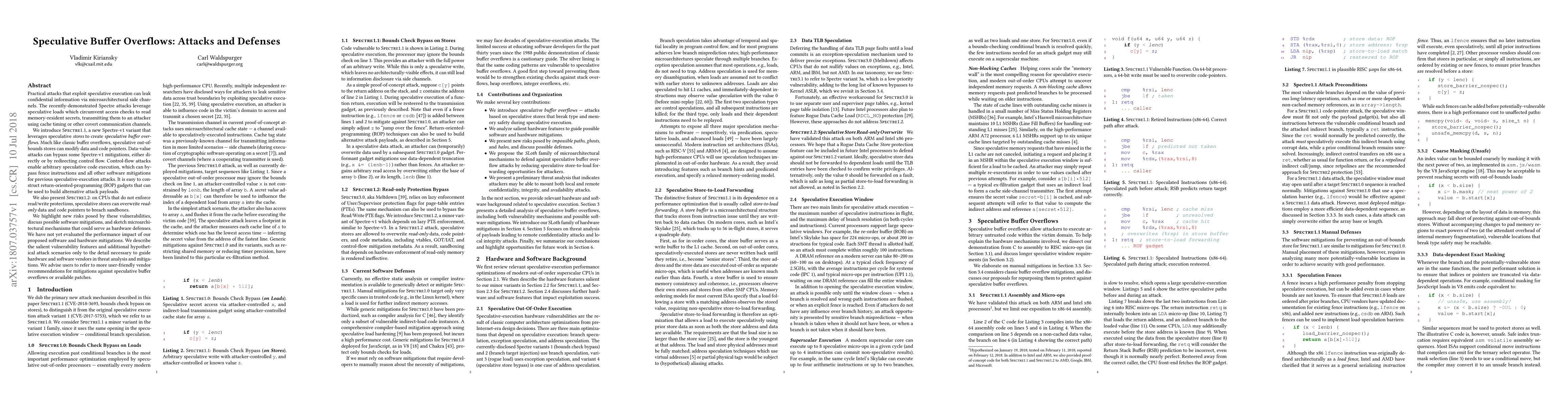 This paper introduces new variants of speculative execution attacks, Spectre1.1 and Spectre1.2, which exploit speculative buffer overflows and speculative stores to bypass existing defenses and execute arbitrary code. It discusses potential mitigations and emphasizes the need for hardware and software improvements to address these vulnerabilities.