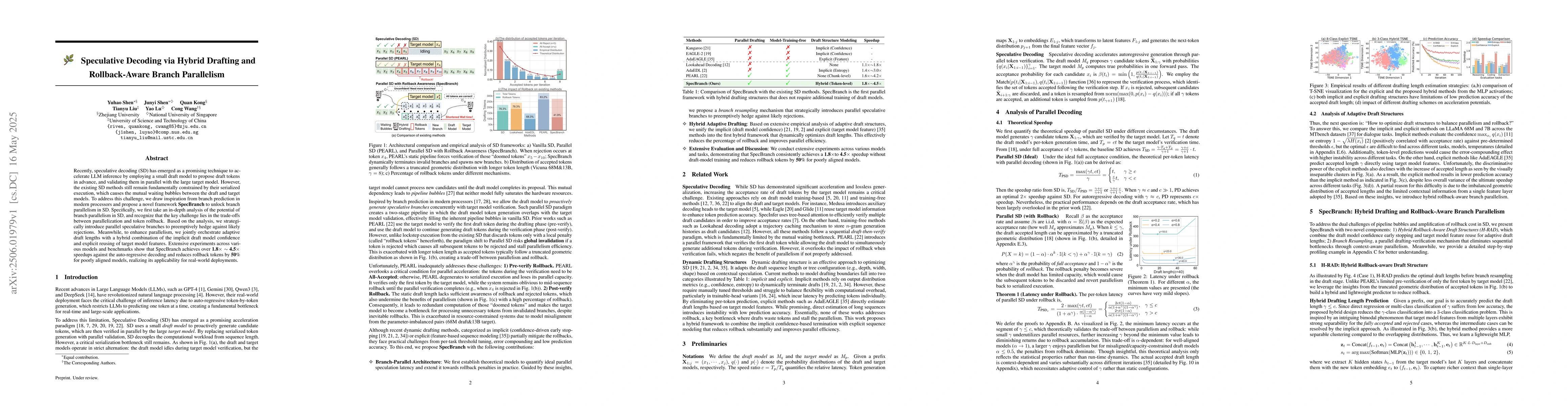 SpecBranch introduces a rollback-aware branch parallelism framework for speculative decoding, enhancing parallelism through adaptive draft lengths and strategic use of draft model confidence and target model features.