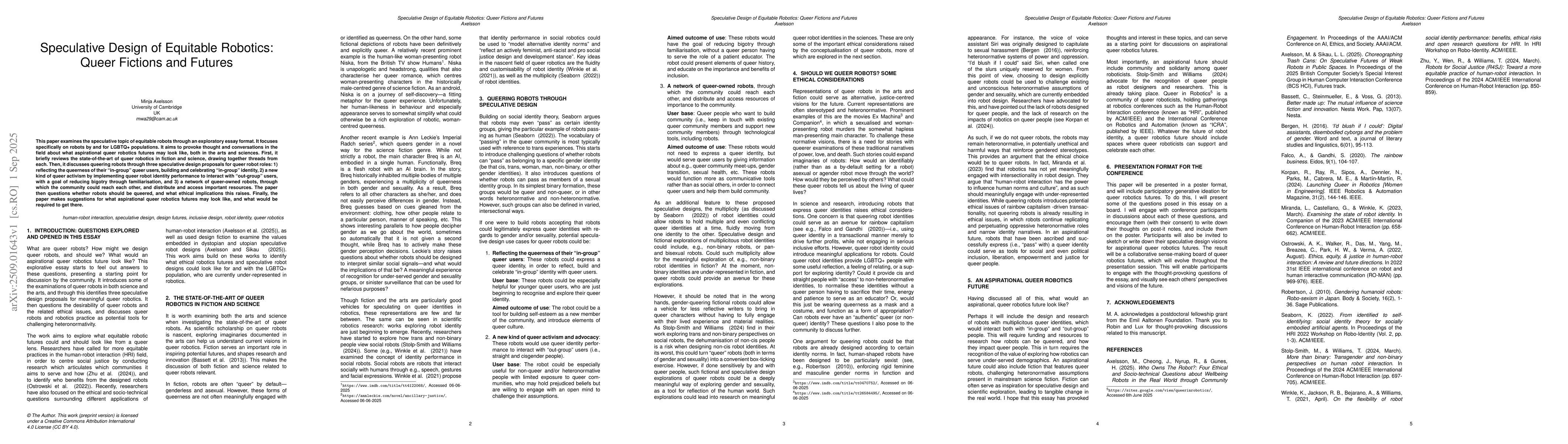 This paper examines the speculative topic of equitable robots through an exploratory essay format. It focuses specifically on robots by and for LGBTQ+ populations. It aims to provoke thought and conversations in the field about what aspirational queer robotics futures may look like, both in the arts and sciences. First, it briefly reviews the state-of-the-art of queer robotics in fiction and science, drawing together threads from each. Then, it discusses queering robots through three speculative design proposals for queer robot roles: 1) reflecting the queerness of their ''in-group'' queer users, building and celebrating ''in-group'' identity, 2) a new kind of queer activism by implementing queer robot identity performance to interact with ''out-group'' users, with a goal of reducing bigotry through familiarisation, and 3) a network of queer-owned robots, through which the community could reach each other, and distribute and access important resources. The paper then questions whether robots should be queered, and what ethical implications this raises. Finally, the paper makes suggestions for what aspirational queer robotics futures may look like, and what would be required to get there.