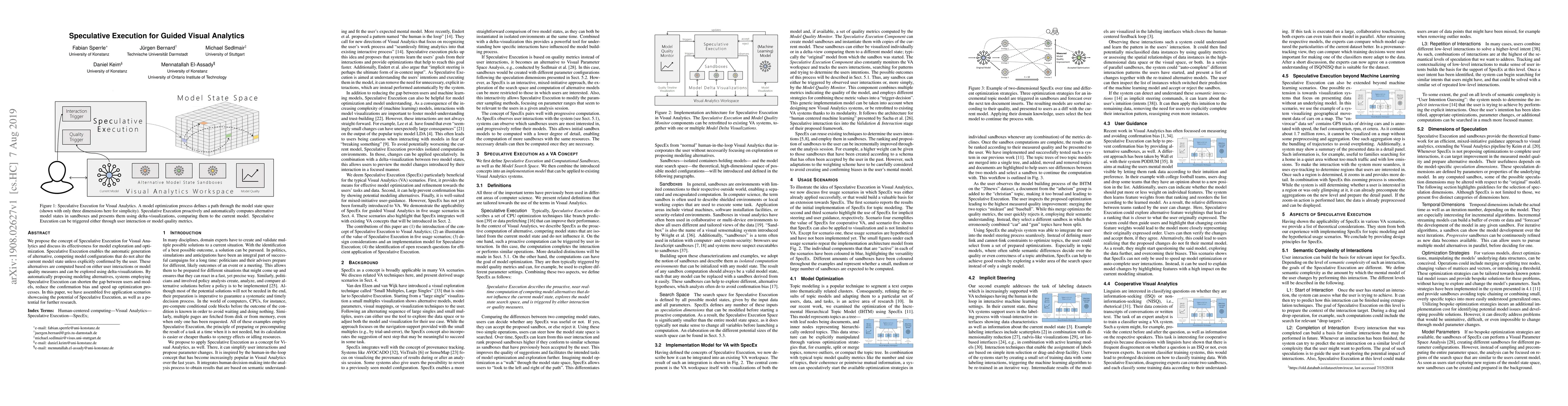 This paper introduces Speculative Execution for Visual Analytics, enabling the automatic generation of alternative model configurations without altering the current state until confirmed. This approach aims to reduce confirmation bias and speed up optimization by exploring alternatives based on user interactions or model quality measures, demonstrated through five application scenarios.