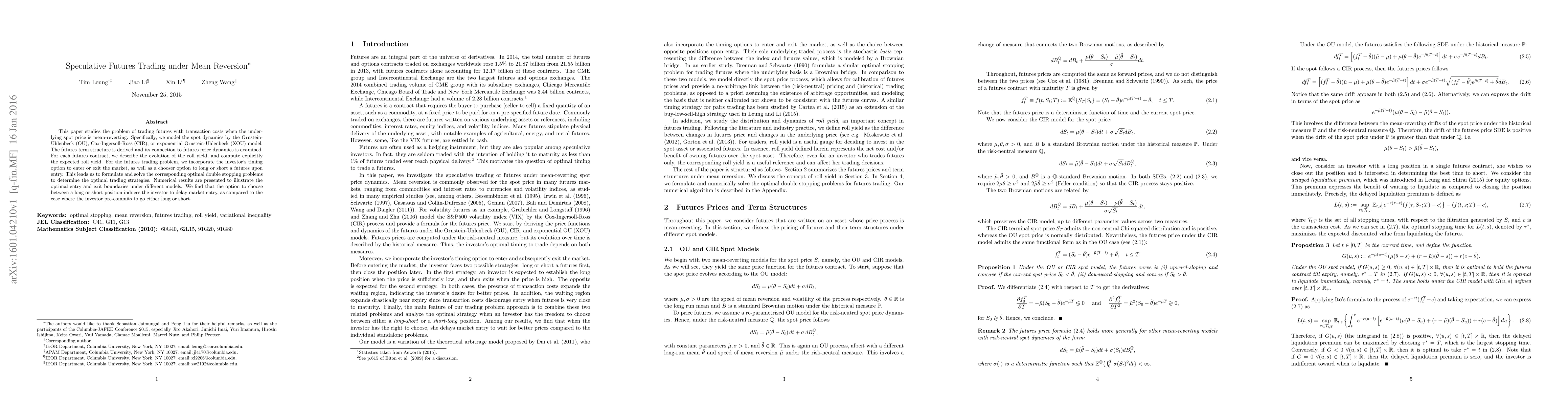 This paper explores optimal speculative futures trading strategies under mean-reversion, using Ornstein-Uhlenbeck, Cox-Ingersoll-Ross, and exponential Ornstein-Uhlenbeck models. It formulates and solves optimal double stopping problems to determine the best entry and exit points, revealing that the option to choose between long or short positions delays market entry.