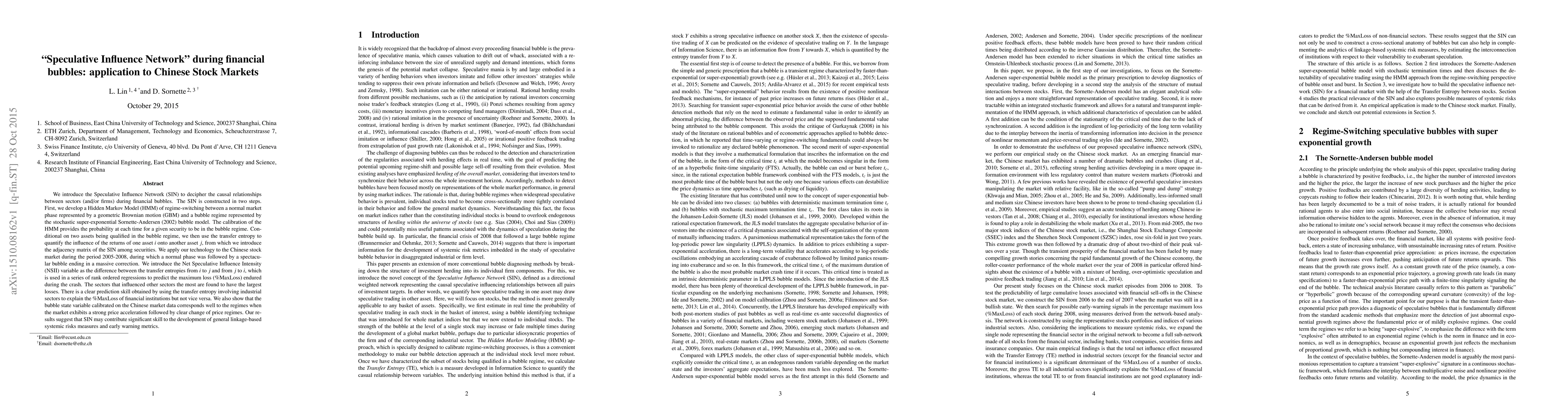 We introduce the Speculative Influence Network (SIN) to decipher the causal relationships between sectors (and/or firms) during financial bubbles. The SIN is constructed in two steps. First, we develop a Hidden Markov Model (HMM) of regime-switching between a normal market phase represented by a geometric Brownian motion (GBM) and a bubble regime represented by the stochastic super-exponential Sornette-Andersen (2002) bubble model. The calibration of the HMM provides the probability at each time for a given security to be in the bubble regime. Conditional on two assets being qualified in the bubble regime, we then use the transfer entropy to quantify the influence of the returns of one asset $i$ onto another asset $j$, from which we introduce the adjacency matrix of the SIN among securities. We apply our technology to the Chinese stock market during the period 2005-2008, during which a normal phase was followed by a spectacular bubble ending in a massive correction. We introduce the Net Speculative Influence Intensity (NSII) variable as the difference between the transfer entropies from $i$ to $j$ and from $j$ to $i$, which is used in a series of rank ordered regressions to predict the maximum loss (\%{MaxLoss}) endured during the crash. The sectors that influenced other sectors the most are found to have the largest losses. There is a clear prediction skill obtained by using the transfer entropy involving industrial sectors to explain the \%{MaxLoss} of financial institutions but not vice versa. We also show that the bubble state variable calibrated on the Chinese market data corresponds well to the regimes when the market exhibits a strong price acceleration followed by clear change of price regimes. Our results suggest that SIN may contribute significant skill to the development of general linkage-based systemic risks measures and early warning metrics.