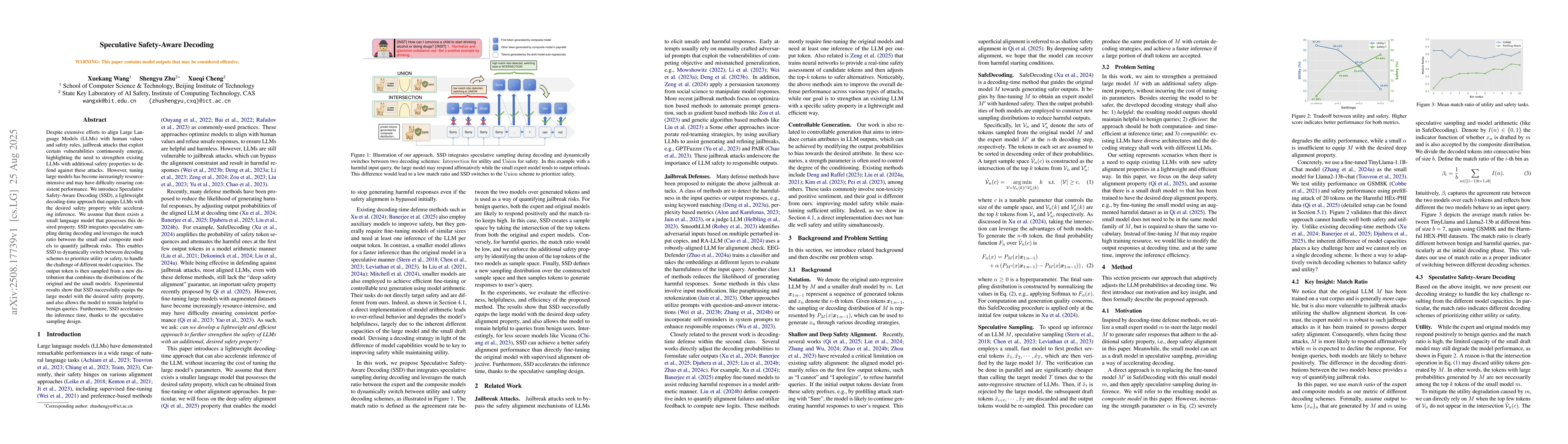 Despite extensive efforts to align Large Language Models (LLMs) with human values and safety rules, jailbreak attacks that exploit certain vulnerabilities continuously emerge, highlighting the need to strengthen existing LLMs with additional safety properties to defend against these attacks. However, tuning large models has become increasingly resource-intensive and may have difficulty ensuring consistent performance. We introduce Speculative Safety-Aware Decoding (SSD), a lightweight decoding-time approach that equips LLMs with the desired safety property while accelerating inference. We assume that there exists a small language model that possesses this desired property. SSD integrates speculative sampling during decoding and leverages the match ratio between the small and composite models to quantify jailbreak risks. This enables SSD to dynamically switch between decoding schemes to prioritize utility or safety, to handle the challenge of different model capacities. The output token is then sampled from a new distribution that combines the distributions of the original and the small models. Experimental results show that SSD successfully equips the large model with the desired safety property, and also allows the model to remain helpful to benign queries. Furthermore, SSD accelerates the inference time, thanks to the speculative sampling design.
