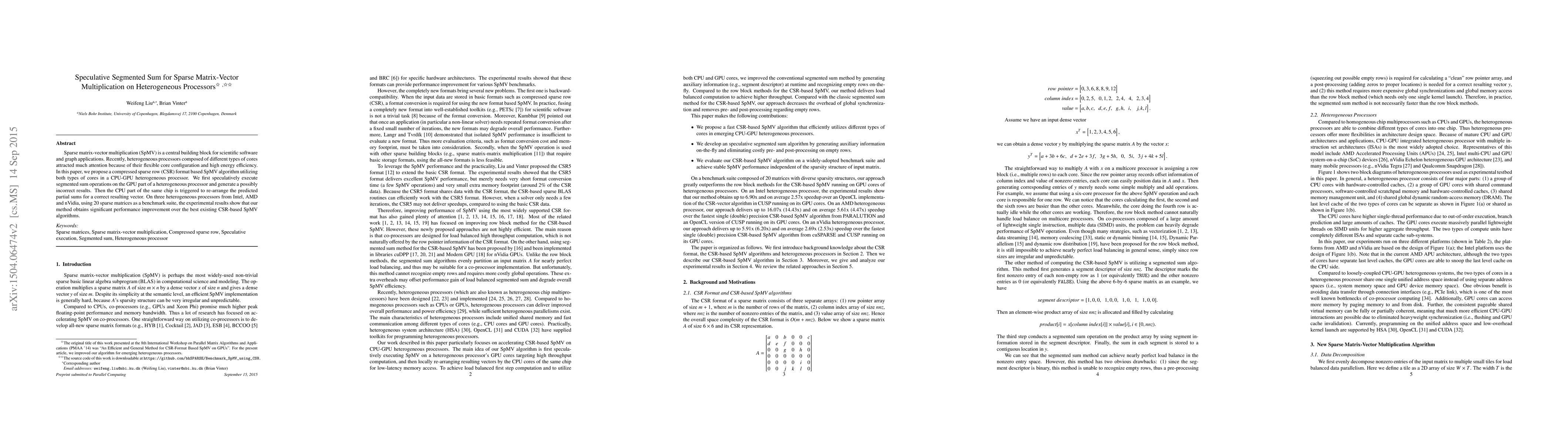 This paper proposes a novel speculative segmented sum algorithm for sparse matrix-vector multiplication on CPU-GPU heterogeneous processors, achieving significant performance improvements over existing CSR-based methods. The approach involves speculative GPU computation and CPU correction, validated on three different processors with benchmark results available on GitHub.