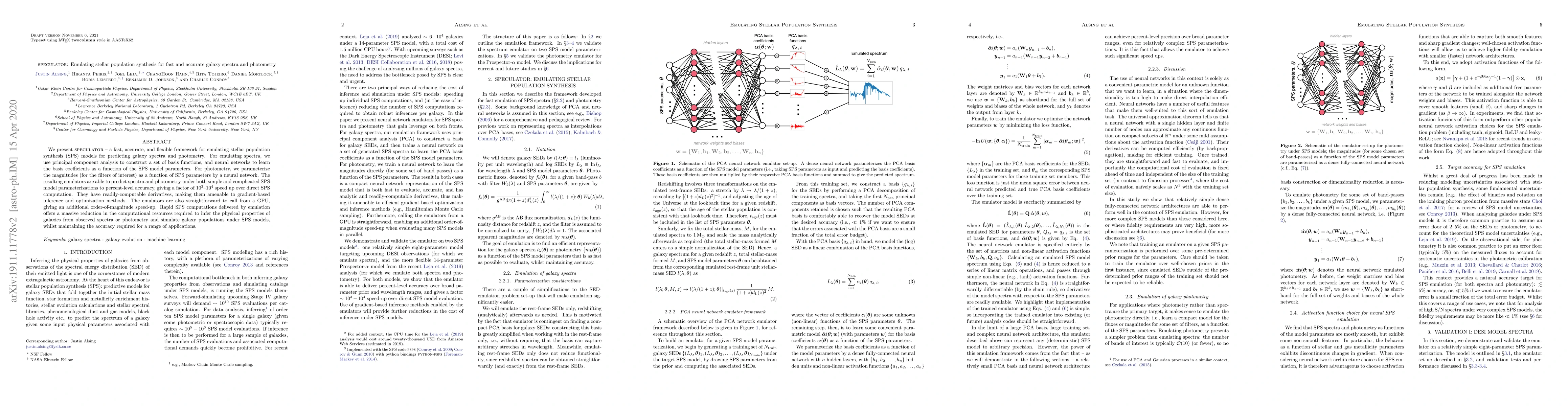 SPECULATOR is a fast and accurate framework for emulating stellar population synthesis models, using neural networks and principal component analysis to predict galaxy spectra and photometry with high precision and speed, significantly reducing computational resources needed for galaxy simulations.