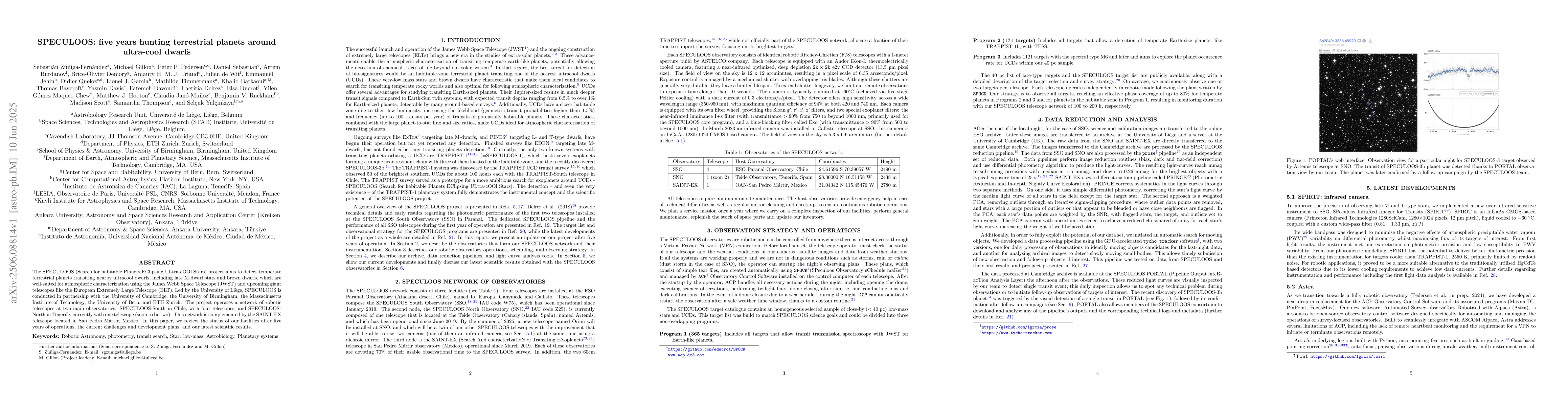 The SPECULOOS project, after five years, operates a network of robotic telescopes to detect Earth-sized planets around nearby ultra-cool dwarfs. Their latest findings and development plans for enhanced facilities with JWST and ELT are detailed, aiming for atmospheric characterization of these exoplanets.