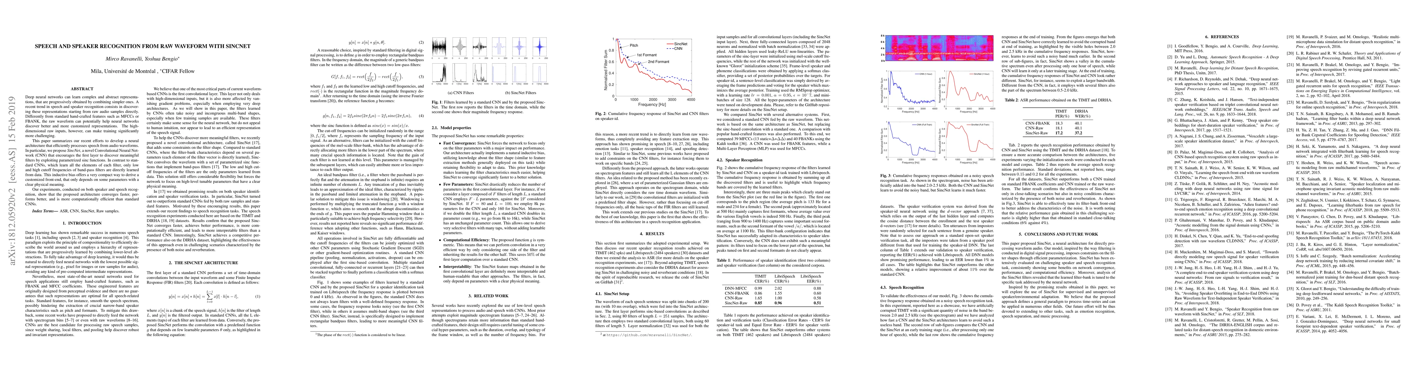 This paper proposes SincNet, a novel Convolutional Neural Network designed to efficiently process raw audio waveforms for speech and speaker recognition. Unlike traditional CNNs, SincNet uses parametrized sinc functions to learn only cutoff frequencies, leading to faster convergence, better performance, and computational efficiency.