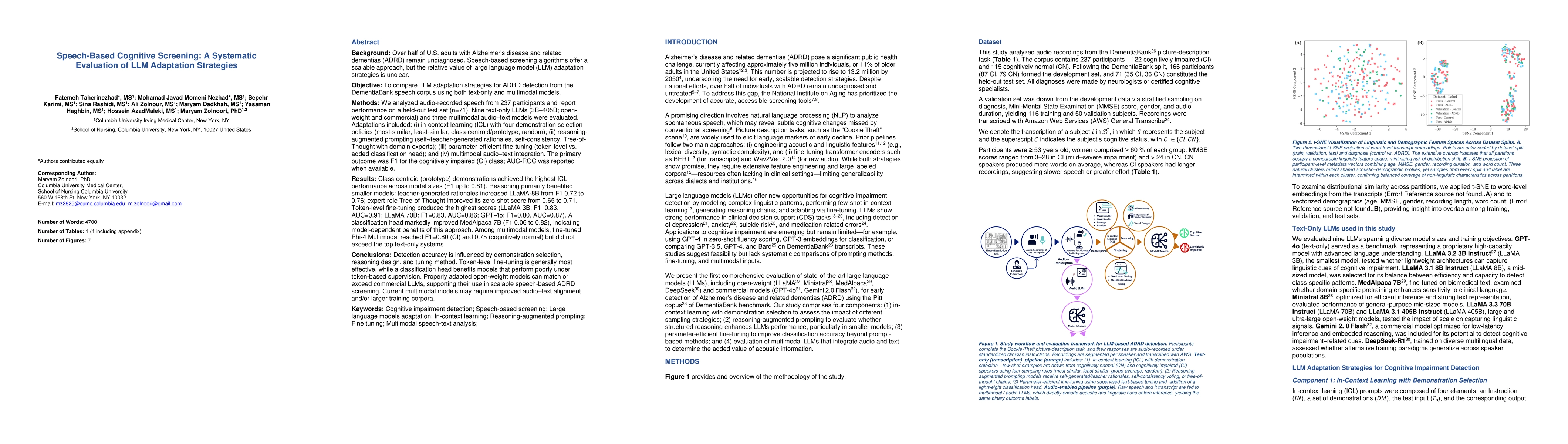 Over half of US adults with Alzheimer disease and related dementias remain undiagnosed, and speech-based screening offers a scalable detection approach. We compared large language model adaptation strategies for dementia detection using the DementiaBank speech corpus, evaluating nine text-only models and three multimodal audio-text models on recordings from DementiaBank speech corpus. Adaptations included in-context learning with different demonstration selection policies, reasoning-augmented prompting, parameter-efficient fine-tuning, and multimodal integration. Results showed that class-centroid demonstrations achieved the highest in-context learning performance, reasoning improved smaller models, and token-level fine-tuning generally produced the best scores. Adding a classification head substantially improved underperforming models. Among multimodal models, fine-tuned audio-text systems performed well but did not surpass the top text-only models. These findings highlight that model adaptation strategies, including demonstration selection, reasoning design, and tuning method, critically influence speech-based dementia detection, and that properly adapted open-weight models can match or exceed commercial systems.