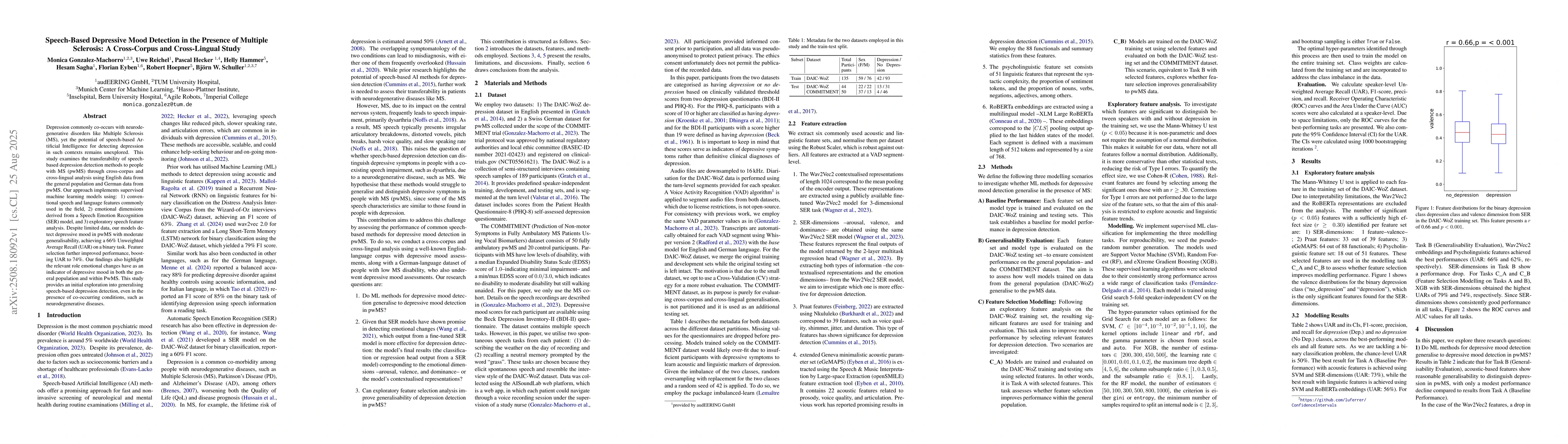 Depression commonly co-occurs with neurodegenerative disorders like Multiple Sclerosis (MS), yet the potential of speech-based Artificial Intelligence for detecting depression in such contexts remains unexplored. This study examines the transferability of speech-based depression detection methods to people with MS (pwMS) through cross-corpus and cross-lingual analysis using English data from the general population and German data from pwMS. Our approach implements supervised machine learning models using: 1) conventional speech and language features commonly used in the field, 2) emotional dimensions derived from a Speech Emotion Recognition (SER) model, and 3) exploratory speech feature analysis. Despite limited data, our models detect depressive mood in pwMS with moderate generalisability, achieving a 66% Unweighted Average Recall (UAR) on a binary task. Feature selection further improved performance, boosting UAR to 74%. Our findings also highlight the relevant role emotional changes have as an indicator of depressive mood in both the general population and within PwMS. This study provides an initial exploration into generalising speech-based depression detection, even in the presence of co-occurring conditions, such as neurodegenerative diseases.