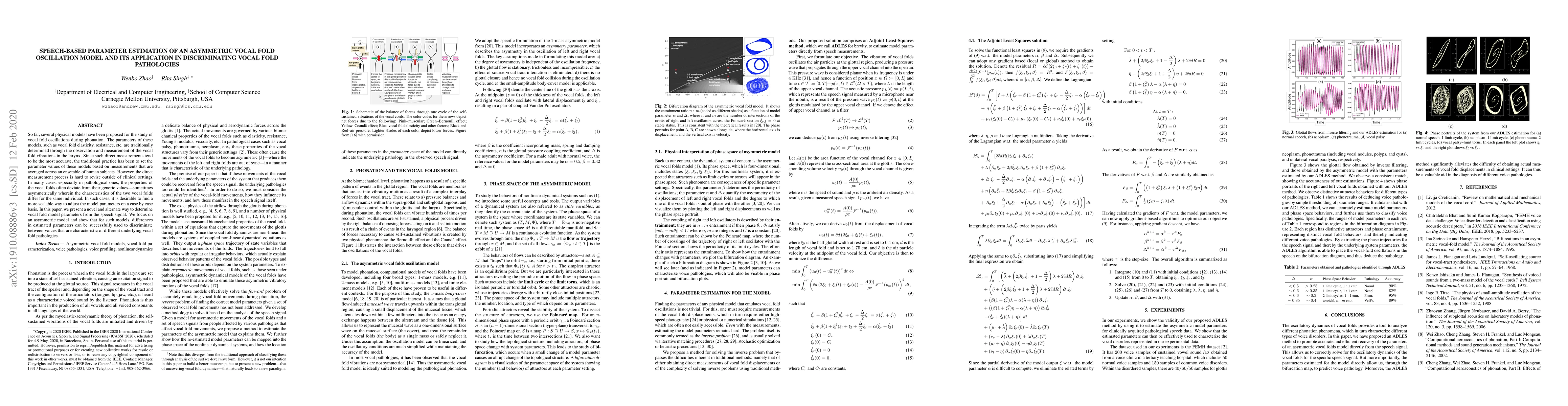 So far, several physical models have been proposed for the study of vocal fold oscillations during phonation. The parameters of these models, such as vocal fold elasticity, resistance, etc. are traditionally determined through the observation and measurement of the vocal fold vibrations in the larynx. Since such direct measurements tend to be the most accurate, the traditional practice has been to set the parameter values of these models based on measurements that are averaged across an ensemble of human subjects. However, the direct measurement process is hard to revise outside of clinical settings. In many cases, especially in pathological ones, the properties of the vocal folds often deviate from their generic values---sometimes asymmetrically wherein the characteristics of the two vocal folds differ for the same individual. In such cases, it is desirable to find a more scalable way to adjust the model parameters on a case by case basis. In this paper, we present a novel and alternate way to determine vocal fold model parameters from the speech signal. We focus on an asymmetric model and show that for such models, differences in estimated parameters can be successfully used to discriminate between voices that are characteristic of different underlying vocal fold pathologies.