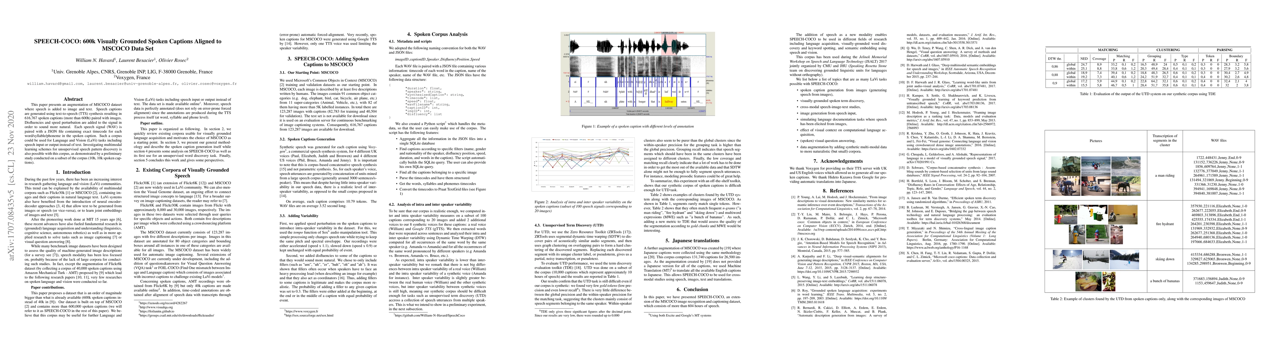 This paper introduces SPEECH-COCO, an augmented MSCOCO dataset featuring 616,767 naturally sounding spoken captions generated via TTS, paired with corresponding images and detailed timecode annotations. The dataset supports Language and Vision tasks and enables research into unsupervised multimodal learning.