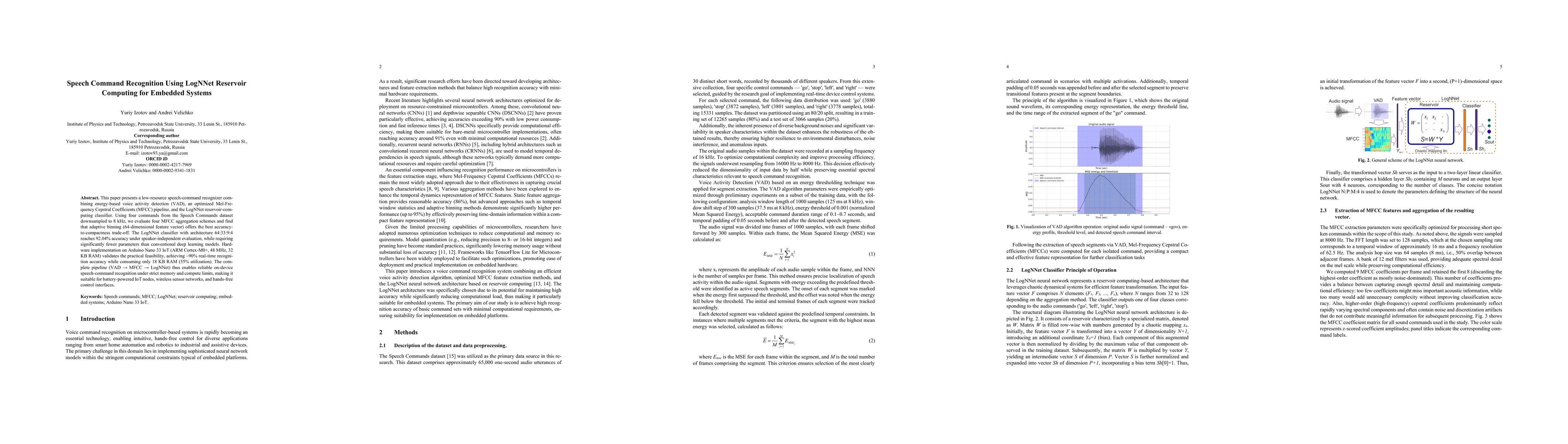 This paper presents a low-resource speech-command recognizer combining energy-based voice activity detection (VAD), an optimized Mel-Frequency Cepstral Coefficients (MFCC) pipeline, and the LogNNet reservoir-computing classifier. Using four commands from the Speech Commands da-taset downsampled to 8 kHz, we evaluate four MFCC aggregation schemes and find that adaptive binning (64-dimensional feature vector) offers the best accuracy-to-compactness trade-off. The LogNNet classifier with architecture 64:33:9:4 reaches 92.04% accuracy under speaker-independent evaluation, while requiring significantly fewer parameters than conventional deep learn-ing models. Hardware implementation on Arduino Nano 33 IoT (ARM Cor-tex-M0+, 48 MHz, 32 KB RAM) validates the practical feasibility, achieving ~90% real-time recognition accuracy while consuming only 18 KB RAM (55% utilization). The complete pipeline (VAD -> MFCC -> LogNNet) thus enables reliable on-device speech-command recognition under strict memory and compute limits, making it suitable for battery-powered IoT nodes, wire-less sensor networks, and hands-free control interfaces.