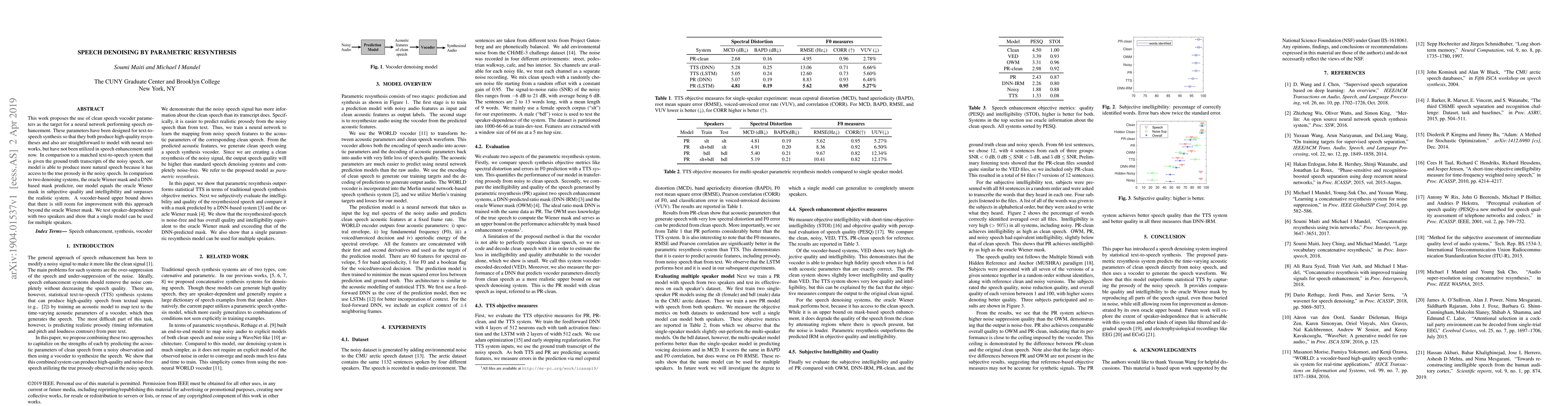 A neural network model uses clean speech vocoder parameters to enhance noisy speech, achieving comparable quality to a matched text-to-speech system and outperforming two denoising systems.