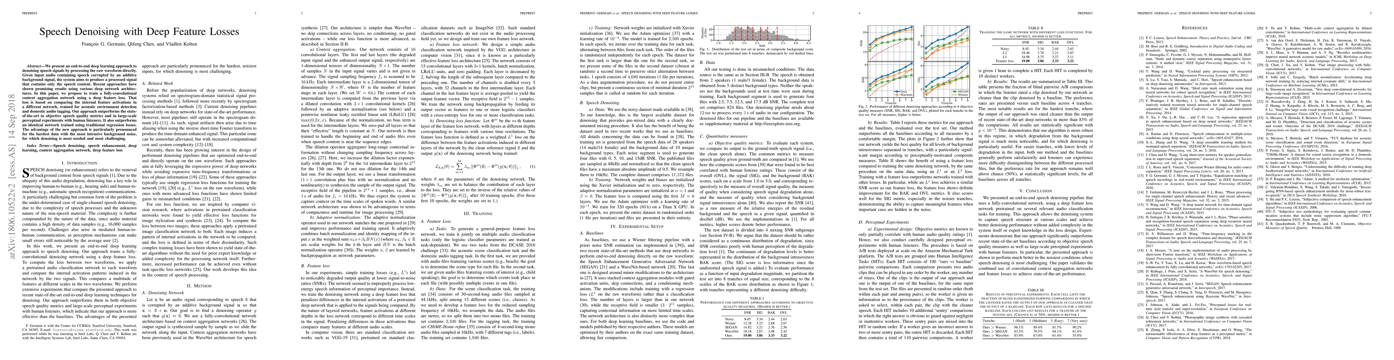 We present an end-to-end deep learning approach to denoising speech signals by processing the raw waveform directly. Given input audio containing speech corrupted by an additive background signal, the system aims to produce a processed signal that contains only the speech content. Recent approaches have shown promising results using various deep network architectures. In this paper, we propose to train a fully-convolutional context aggregation network using a deep feature loss. That loss is based on comparing the internal feature activations in a different network, trained for acoustic environment detection and domestic audio tagging. Our approach outperforms the state-of-the-art in objective speech quality metrics and in large-scale perceptual experiments with human listeners. It also outperforms an identical network trained using traditional regression losses. The advantage of the new approach is particularly pronounced for the hardest data with the most intrusive background noise, for which denoising is most needed and most challenging.