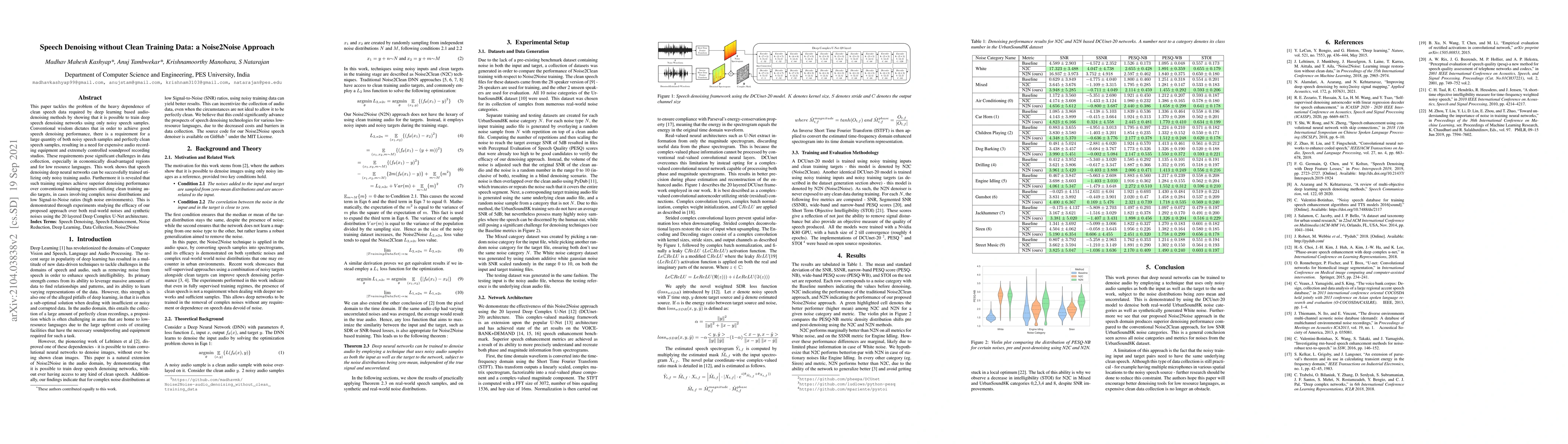 This paper tackles the problem of the heavy dependence of clean speech data required by deep learning based audio-denoising methods by showing that it is possible to train deep speech denoising networks using only noisy speech samples. Conventional wisdom dictates that in order to achieve good speech denoising performance, there is a requirement for a large quantity of both noisy speech samples and perfectly clean speech samples, resulting in a need for expensive audio recording equipment and extremely controlled soundproof recording studios. These requirements pose significant challenges in data collection, especially in economically disadvantaged regions and for low resource languages. This work shows that speech denoising deep neural networks can be successfully trained utilizing only noisy training audio. Furthermore it is revealed that such training regimes achieve superior denoising performance over conventional training regimes utilizing clean training audio targets, in cases involving complex noise distributions and low Signal-to-Noise ratios (high noise environments). This is demonstrated through experiments studying the efficacy of our proposed approach over both real-world noises and synthetic noises using the 20 layered Deep Complex U-Net architecture.