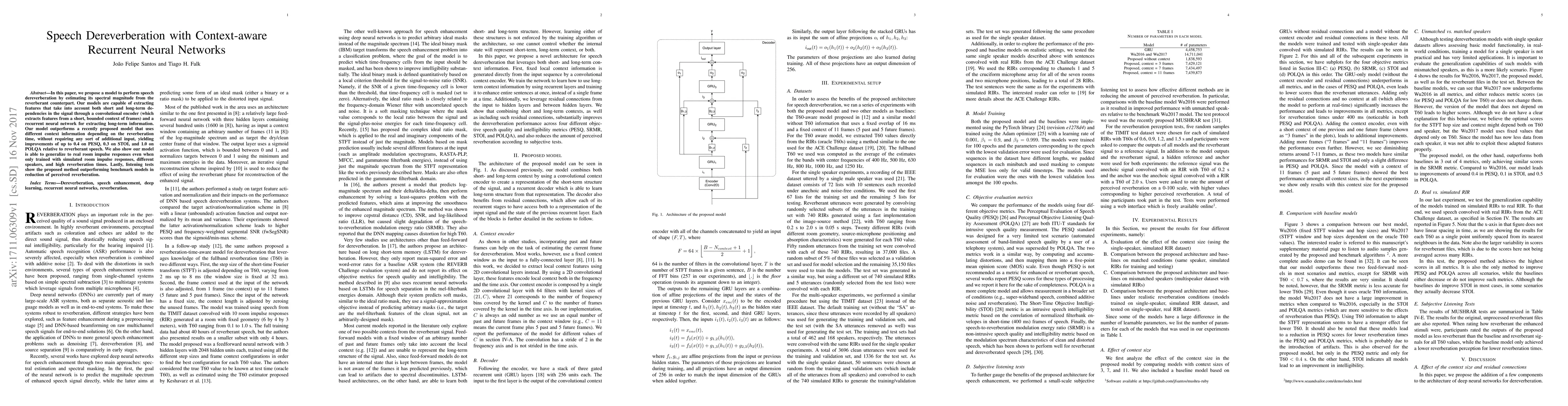 This paper proposes a model that performs speech dereverberation using context-aware recurrent neural networks, achieving significant improvements over existing methods in reducing perceived reverberation with up to 0.4 on PESQ.