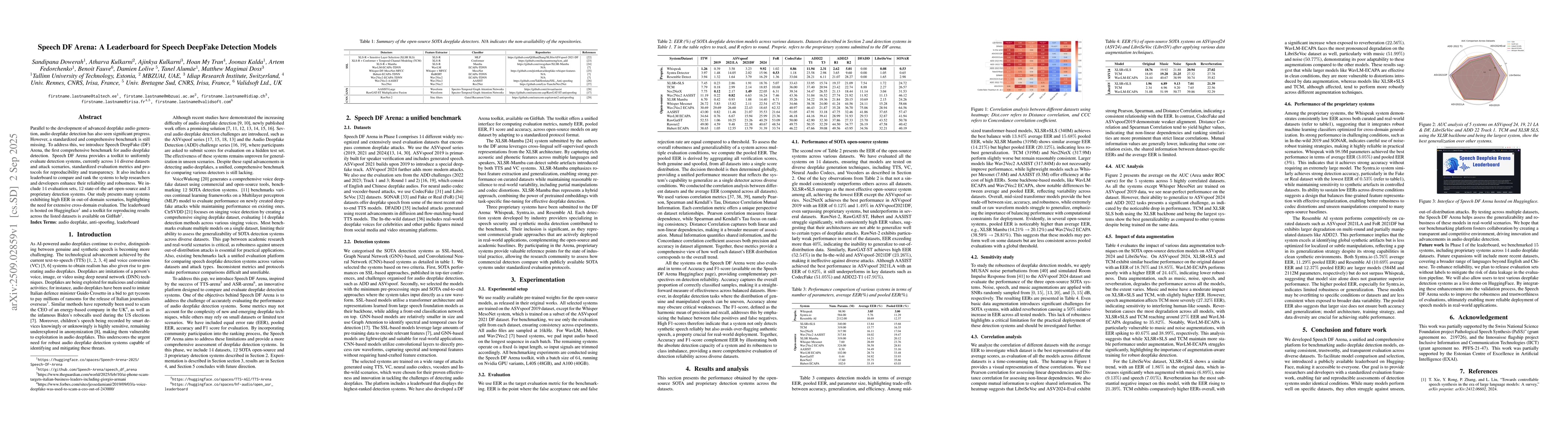 Parallel to the development of advanced deepfake audio generation, audio deepfake detection has also seen significant progress. However, a standardized and comprehensive benchmark is still missing. To address this, we introduce Speech DeepFake (DF) Arena, the first comprehensive benchmark for audio deepfake detection. Speech DF Arena provides a toolkit to uniformly evaluate detection systems, currently across 14 diverse datasets and attack scenarios, standardized evaluation metrics and protocols for reproducibility and transparency. It also includes a leaderboard to compare and rank the systems to help researchers and developers enhance their reliability and robustness. We include 14 evaluation sets, 12 state-of-the-art open-source and 3 proprietary detection systems. Our study presents many systems exhibiting high EER in out-of-domain scenarios, highlighting the need for extensive cross-domain evaluation. The leaderboard is hosted on Huggingface1 and a toolkit for reproducing results across the listed datasets is available on GitHub.